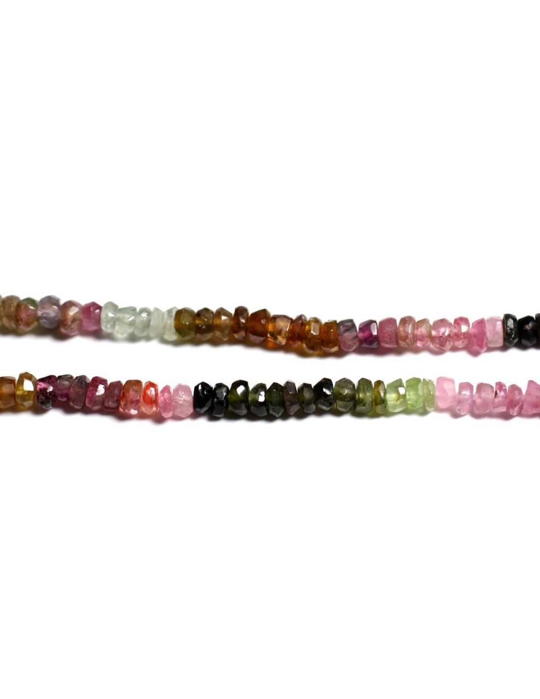 Mehrfarbige Turmalinsteinperlen Facettierte Rondellen Natürlicher Halbedelstein Farbe Blau, Grün, Ockerorange, Rosa, Lila, Transparent Form Facettierte Rondellen Abmessungen ca. 3x2 mm Bohrabmessungen ca. 0,3 mm Verkauft mit einem Faden von ca. 150 Perlen