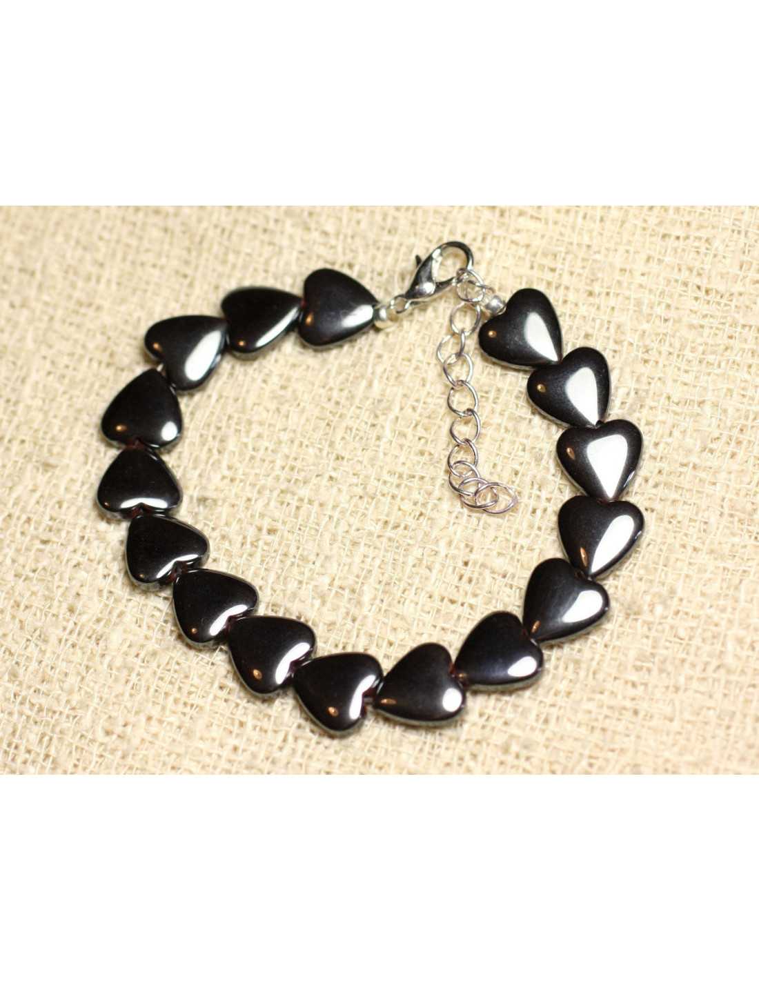Armband Silber 925 und Hämatit Stein Herzen Halbedelstein Naturfarbe Grau Schwarz Perlen Herzen Maße 10mm ca. Karabinerverschluss und Kette in 925/1000 Silber Länge 17cm + 4cm Silberkette Armband aus starkem und widerstandsfähigem Nylonfaden