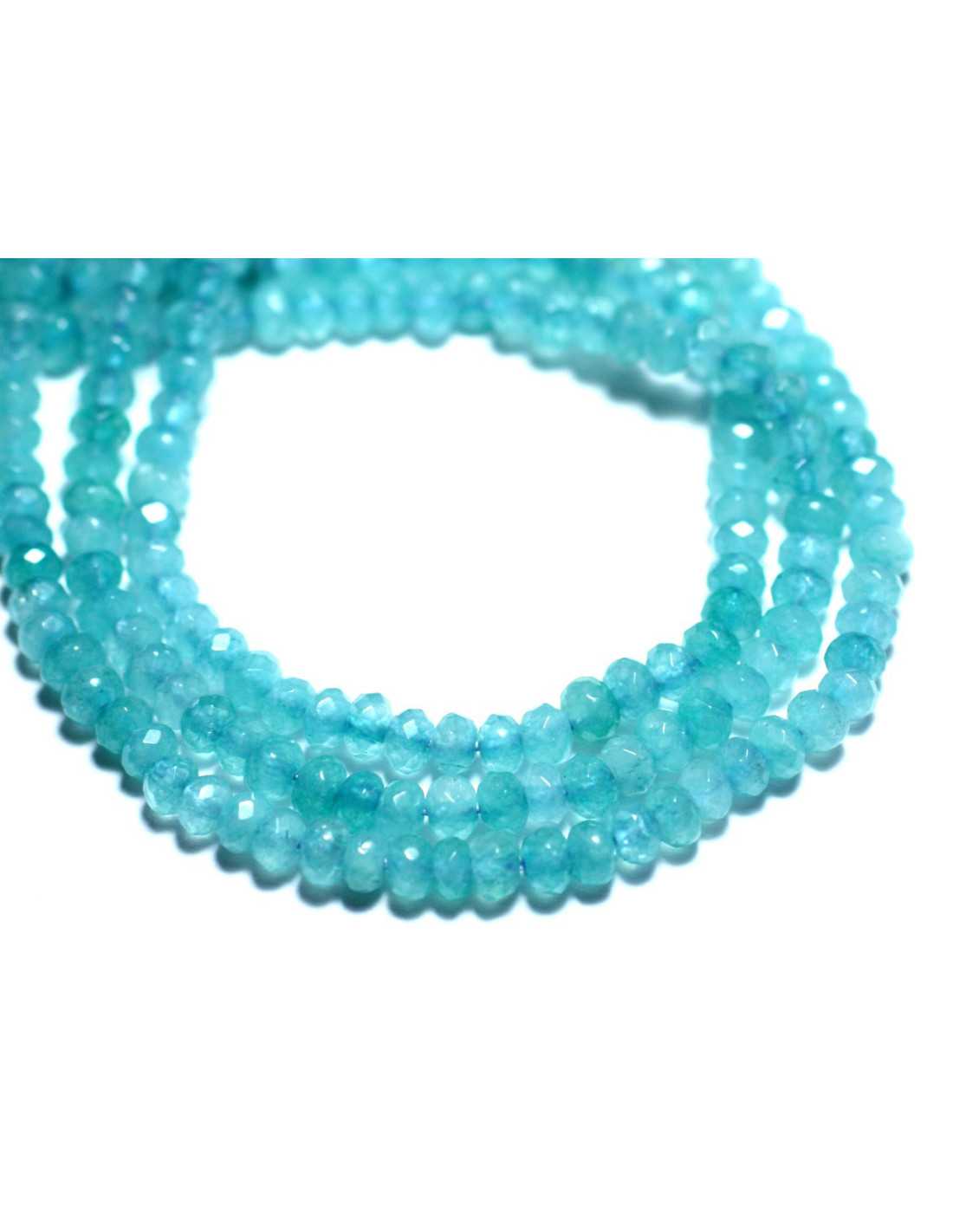 Gewinde 39 cm - Jadesteinperlen Facettierte Rondellen Natürlicher getönter Halbedelstein Farbe hellblau türkis, transparent Form Facettierte Rondellen Abmessungen Durchmesser 4 mm x Dicke 2 mm ungefähr Bohrmaß ca. 0,8 mm Verkauft mit einem Gewinde von 39 cm Ca. 132 Perlen pro Faden