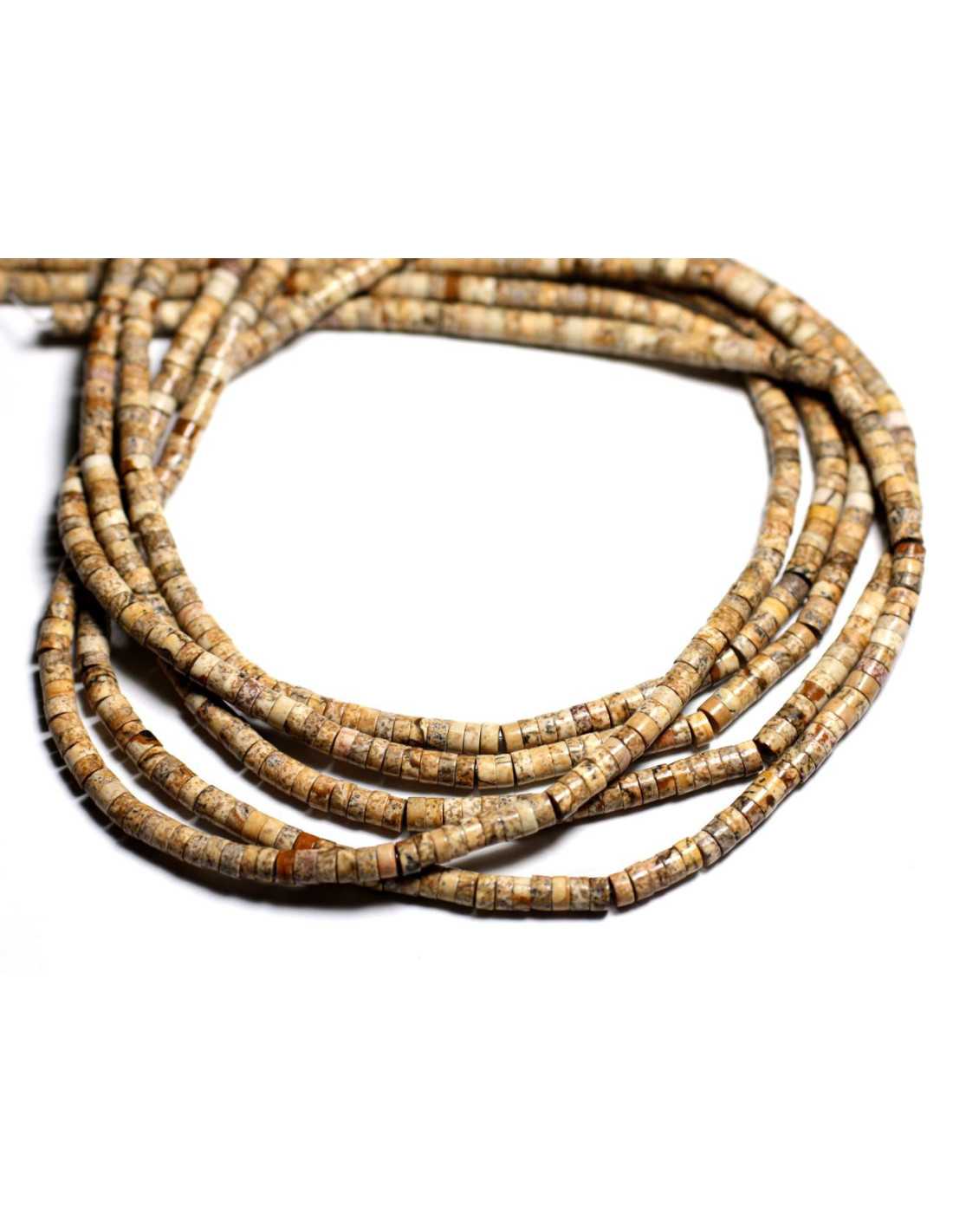 185pc env - Perles de Pierre Jaspe Paysage Pierre semi précieuse naturelle Couleur écru, beige, jaune Forme Rondelles Dimensions Diamètre 4mm x Épaisseur 2mm environ Dimension Perçage 0.8mm environ Vendu par fil de 39cm Environ 185 perles par fil