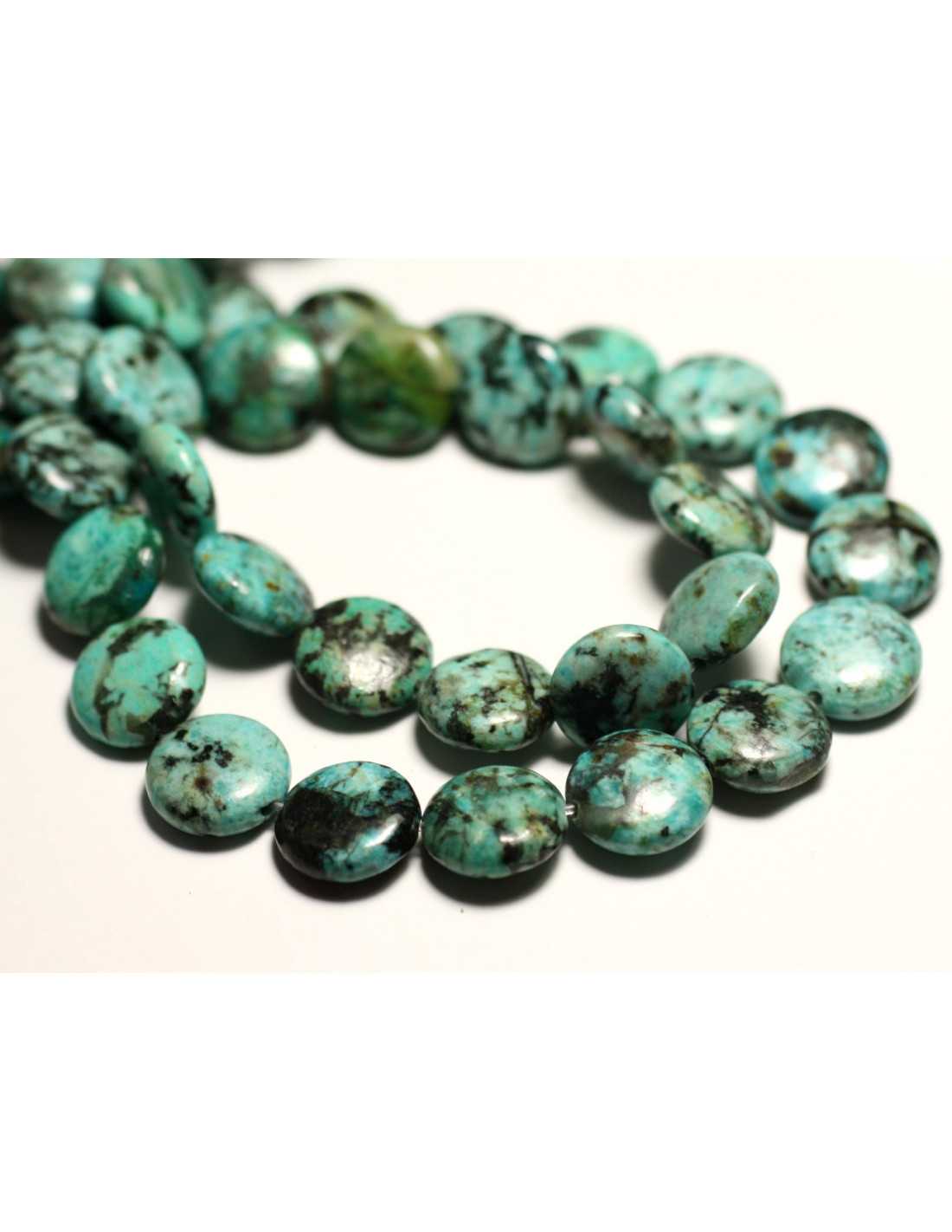 Gewinde 39 cm - afrikanische türkisfarbene Steinperlen Natürlicher Halbedelstein Farbe blau, grün, türkis, braun, schwarz Form Paletten Abmessungen Durchmesser 12 mm x Dicke 5 mm ungefähr Bohrmaß 1 mm ungefähr Verkauft mit einem Gewinde von 39 cm Ungefähr 32 Perlen pro Draht