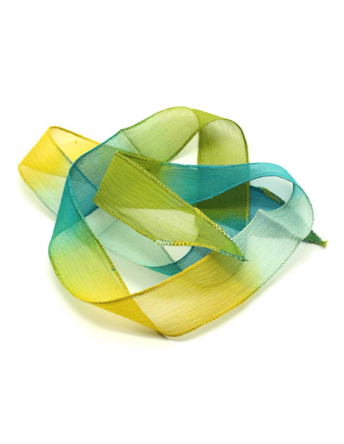 1 Stück - Handgefärbte Seidenbandkette 85 x 2,5 cm Olivgelb Pfauenblau (Ref. SOIE166)