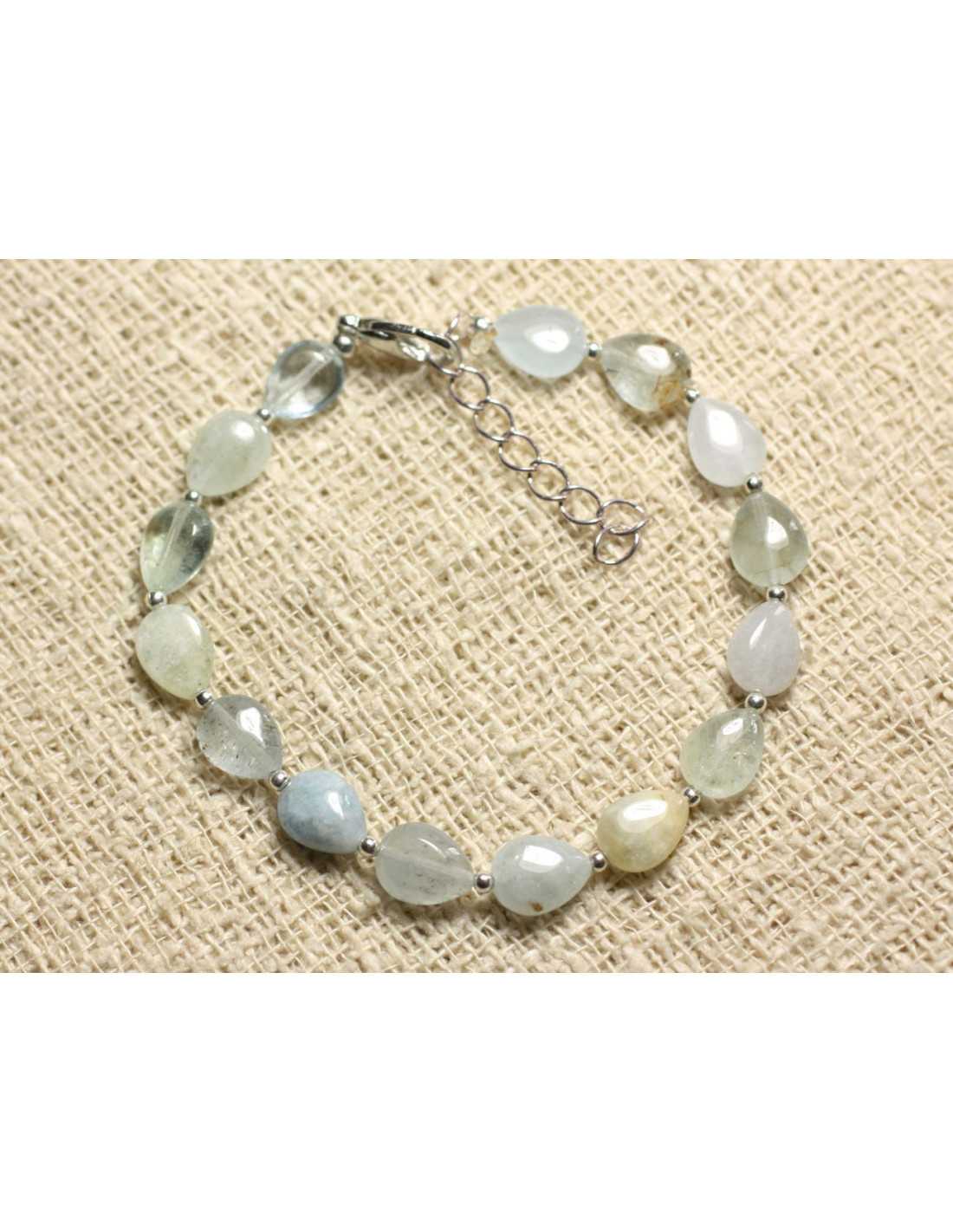 Armband 925 Silber- und Aquamarinstein Natürlicher Halbedelstein Farbe weiß, hellblau, transparent Perlen Tropfen Abmessungen 9x6mm ca. Distanzperlen aus Silber 925/1000 rund 2mm Armband aus starkem und widerstandsfähigem Nylonfaden Hummerverschluss und Kette aus 925/1000 Silber Länge 17 cm + 4 cm Silberkette