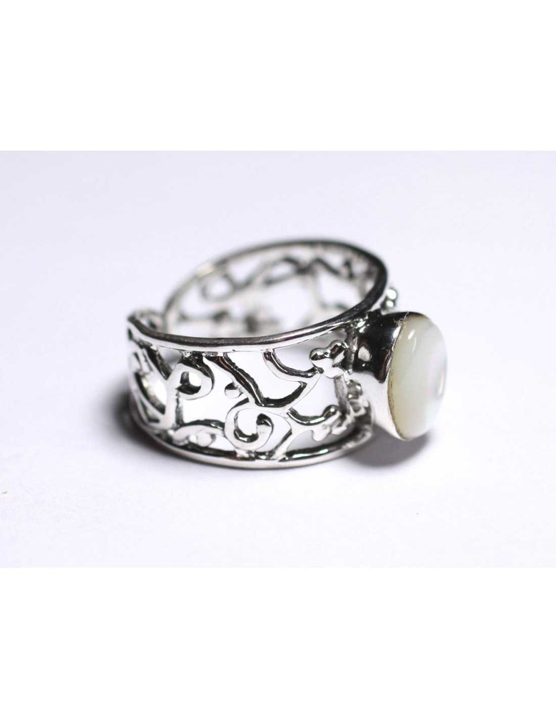 Anillo Plata 925 y nácar blanco iridiscente Nácar blanco natural Color blanco, con reflejos iridiscentes Forma ovalada Dimensión 9x7mm aproximadamente Nácar engastado en plata 925/1000 Anillo grande con motivo arabesco, filigrana Ancho 5 a 11mm Talla mínima ajustable 53