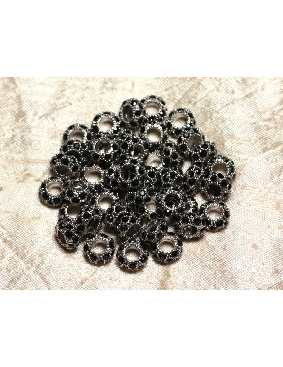 2pc - Arandelas de perlas agujeros grandes de 11 mm - Plata Metal Rodio y diamante de imitación Vidrio Negro - 4558550015594