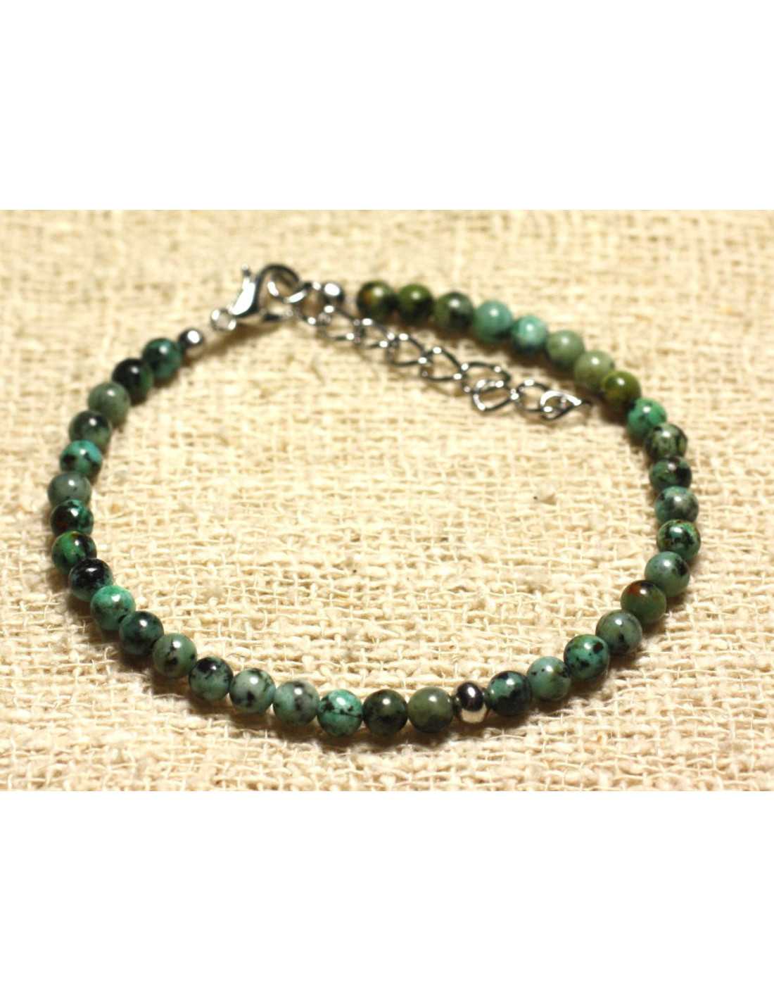 Pulsera Plata 925 y piedra semipreciosa Turquesa africana Piedra semipreciosa natural Color Verde, Turquesa, negro, marrón Cuentas redondas Dimensiones aprox.4 mm Cuentas espaciadoras en plata 925/1000 redondas de 2 mm Pulsera realizada en hilo de nailon fuerte y resistente Cierre de mosquetón y cadena en Plata 925/1000 Longitud 17cm + cadena de plata de 4cm Personalización posible con piedras y colores de su elección