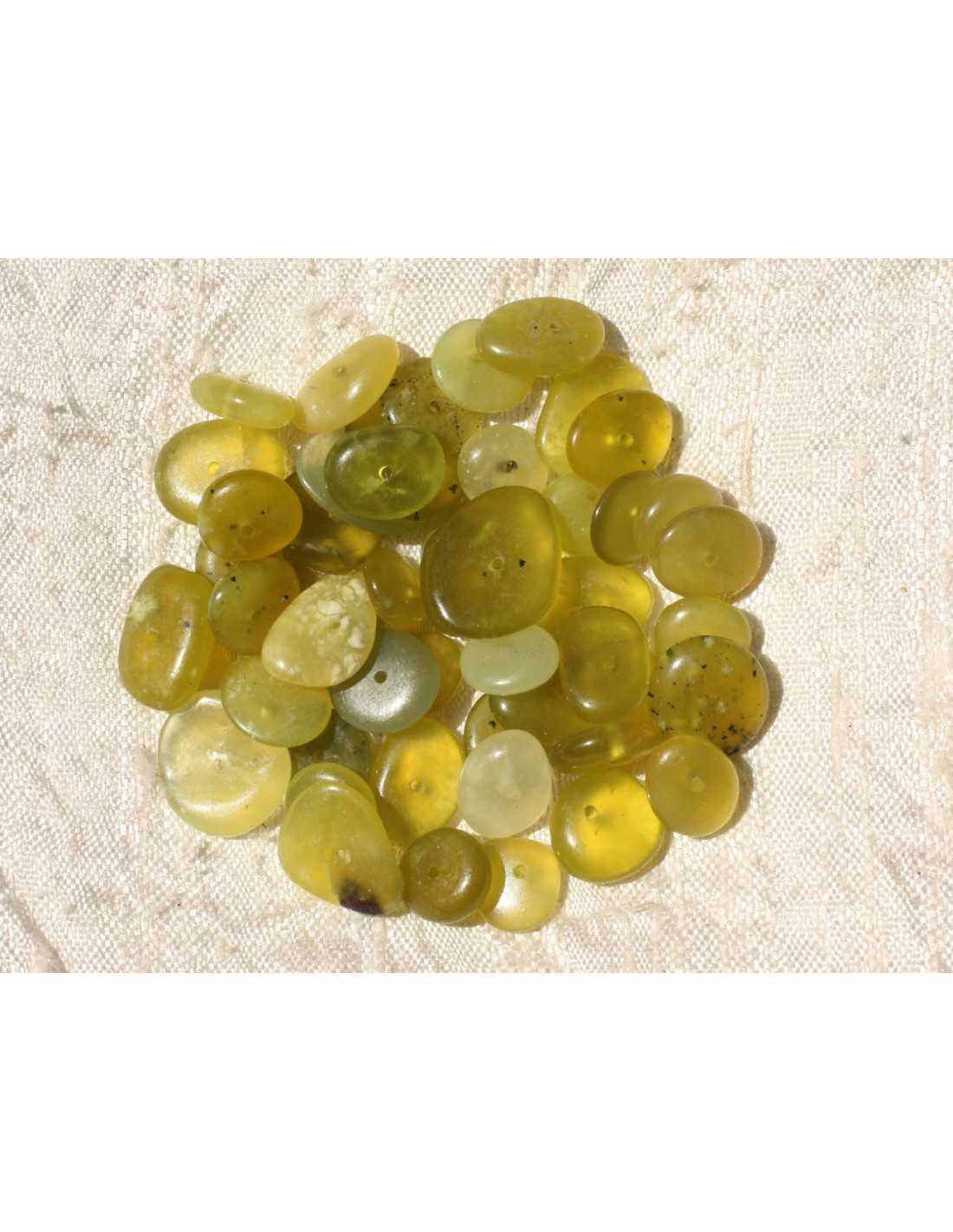 Fil 39cm - Perles de Pierre Jade Olive Pierre semi précieuse naturelle Couleur jaune vert olive, transparent Forme Chips Palets Rondelles Dimensions Diamètre 8-15mm x Épaisseur 2-5mm environ Dimension perçage 1mm environ Vendues par fil de 39cm Environ 130 perles par fil