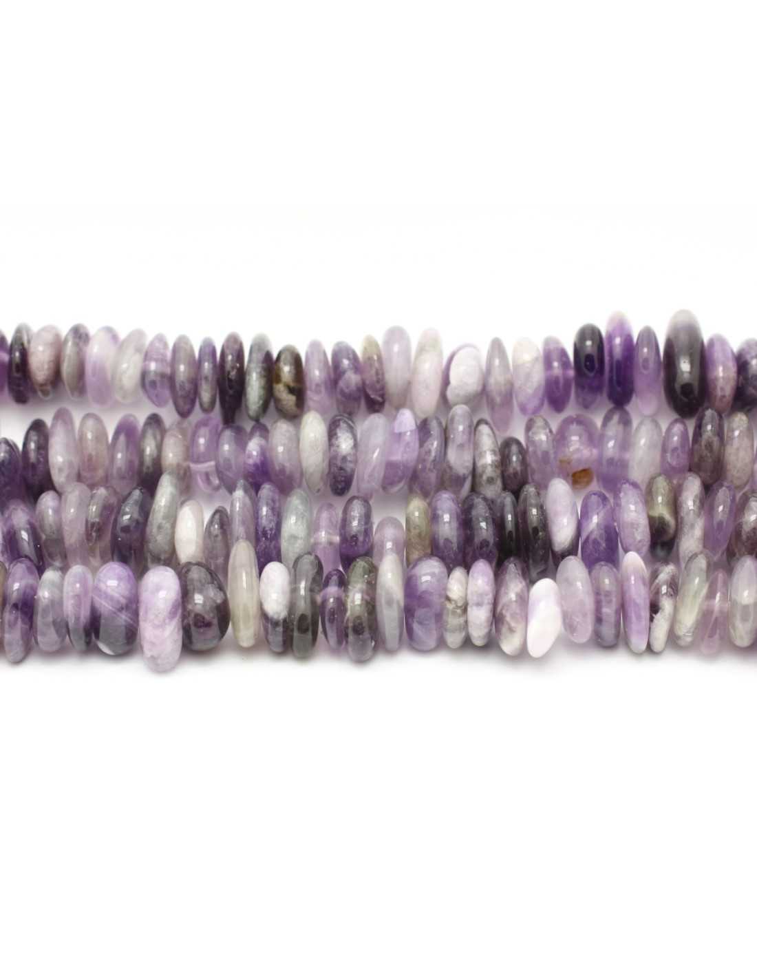 Hilo 39cm - Cuentas de piedra de chevron amatista Piedra semipreciosa natural Color blanco, violeta malva, transparente Forma Chips Paletas Arandelas Dimensiones Diámetro 10-15 mm x Espesor 2-5 mm aproximadamente Tamaño de perforación aproximadamente 1 mm Se vende por alambre de 39 cm Aproximadamente 100 cuentas por alambre