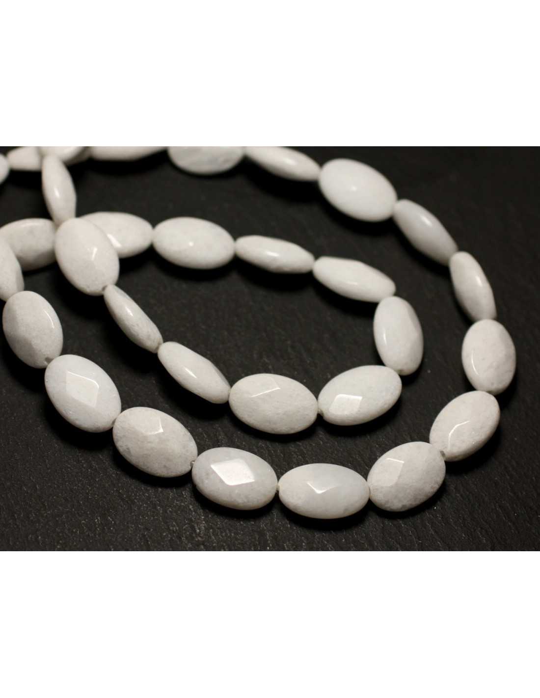 Hilo 39cm - Cuentas de piedra de jade Piedra semipreciosa natural Color Blanco Forma ovalada facetada Dimensiones Largo 14 mm x Ancho 10 mm x Espesor 6 mm aproximadamente Dimensión de perforación 1 mm aproximadamente Se vende por hilo de 39 cm Aproximadamente 26 cuentas por alambre