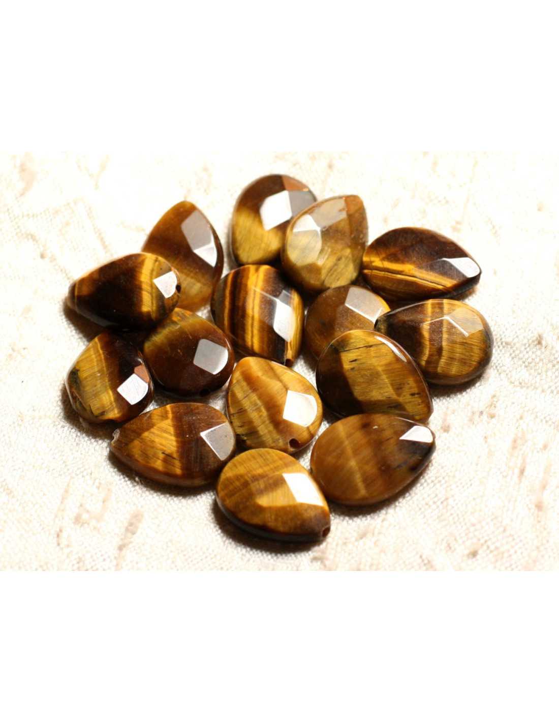 Hilo 39cm - Cuentas de piedra de ojo de tigre Gotas facetadas Piedra semipreciosa natural Color marrón, negro, dorado, bronce, con reflejos Forma de gotas facetadas perforadas en la longitud Dimensiones Longitud 18 mm x Ancho 13 mm x Espesor 4 mm aproximadamente Dimensión de perforación 1 mm aproximadamente Vendido por Hilo de 39 cm Aproximadamente 22 cuentas por hilo
