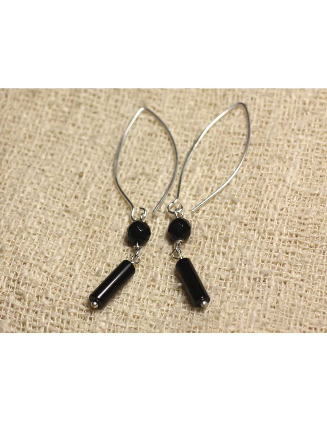 Pendientes de plata 925 Ganchos de 40 mm - Columnas de ónix negro 13x4 mm y redondo facetado de 6 mm