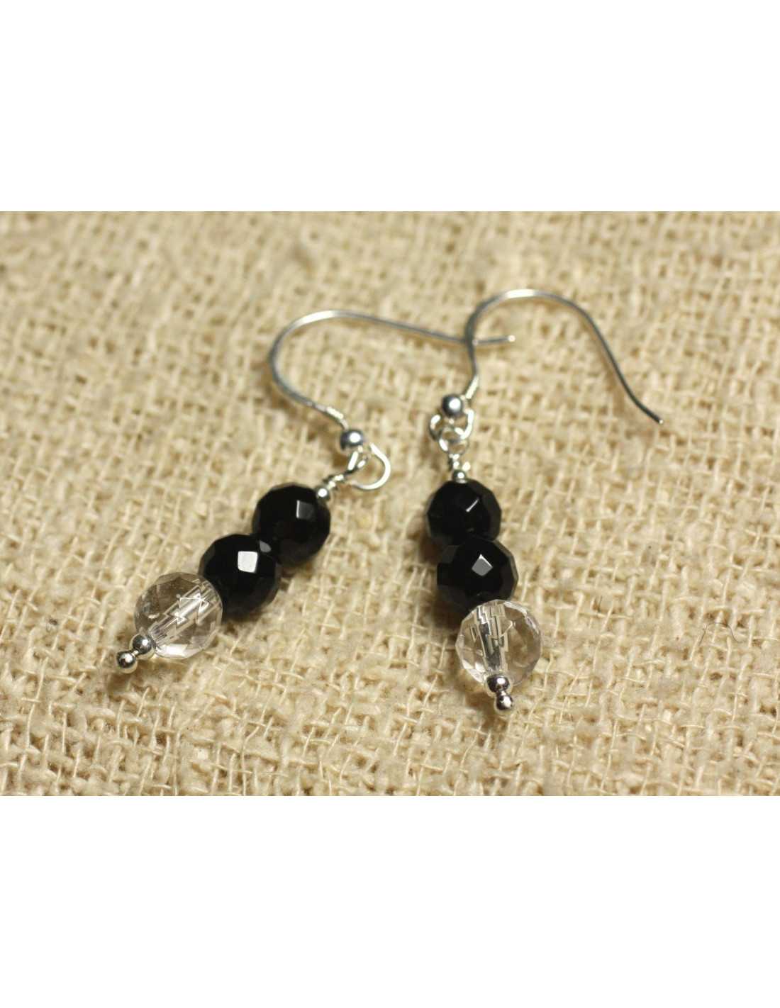 Pendientes de plata 925 - ónix negro y cristal de cuarzo redondo facetado de 6 mm