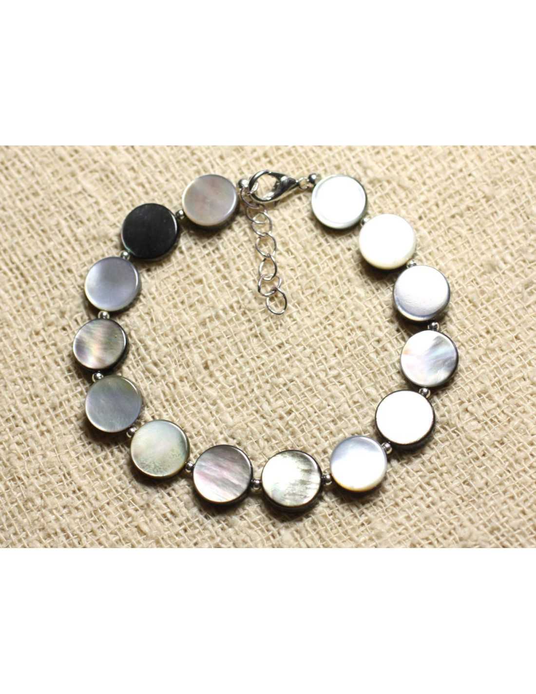 Pulsera de plata 925 Paletas de nácar negro 10 mm Nacarado negro natural Color gris, negro, blanco, iridiscente Paleta de abalorios 10 mm Redondos 925 Cuentas espaciadoras de plata 2 mm Cierre de langosta y cadena de plata 925 Longitud con cierre: 17 cm + 4 cm de cadena de plata