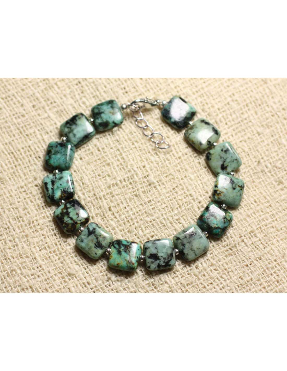 Pulsera Plata 925 y piedra semipreciosa Turquesa africana Cuadrados 10mm Piedra semipreciosa natural Color azul turquesa, marrón, negro Cuentas cuadradas Dimensiones 10mm aproximadamente Cuentas espaciadoras en plata 925/1000 redondas 2mm Pulsera realizada en hilo de nailon fuerte y resistente Cierre de langosta y cadena de plata 925/1000 Longitud 17cm + 4cm cadena de plata