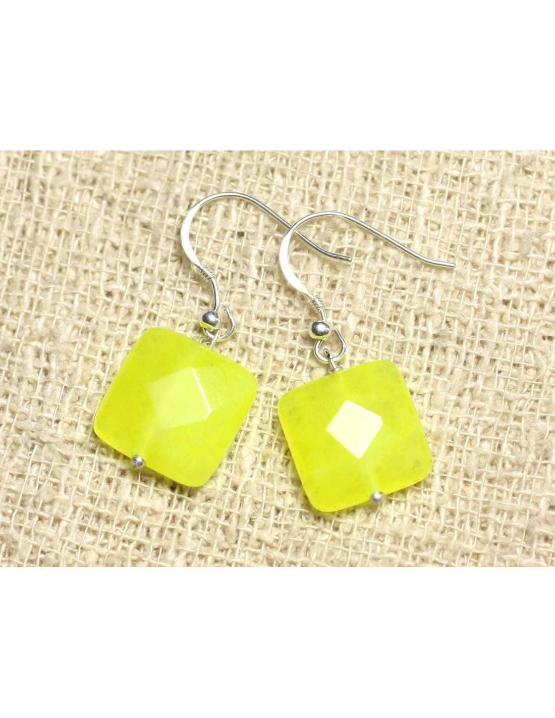 Boucles d'Oreilles Argent 925 et Pierre - Jade Jaune Fluo Carrés Facettés 14mm