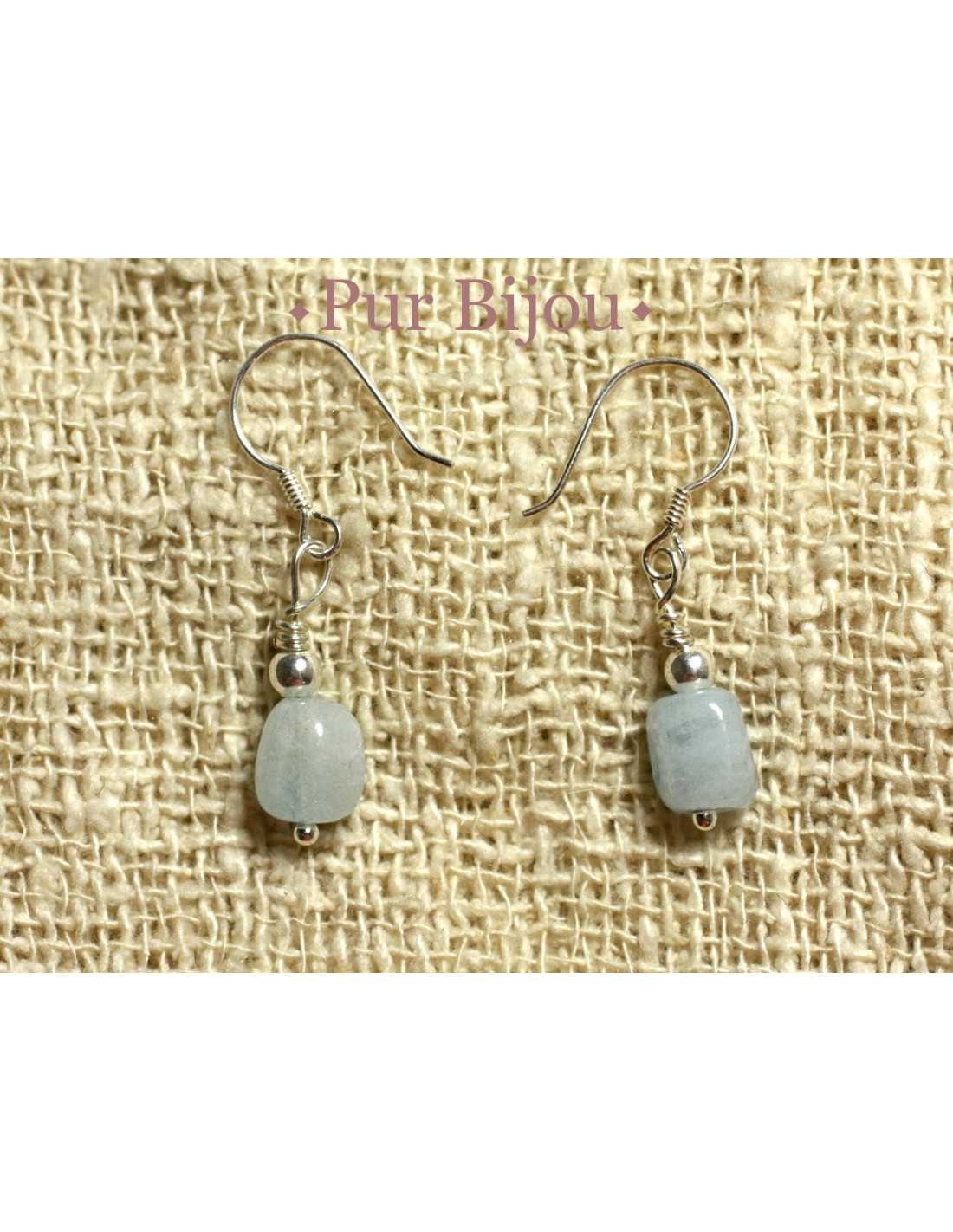 Boucles oreilles Argent 925 et Pierre Aigue Marine Nuggets Rectangles Cubes 7-8mm bleu ciel clair