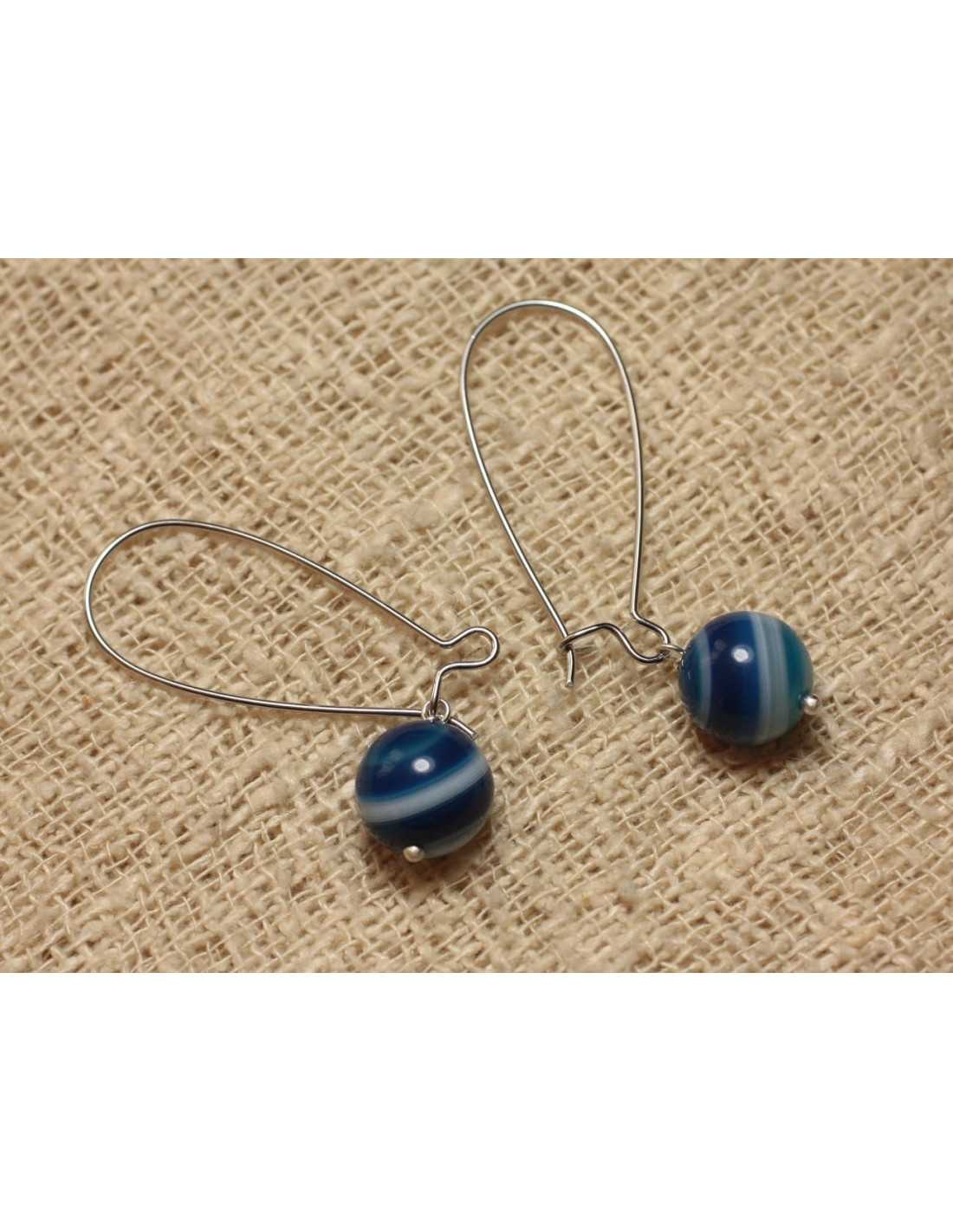 Boucles d'Oreilles Agate Bleue et longs crochets Argentés