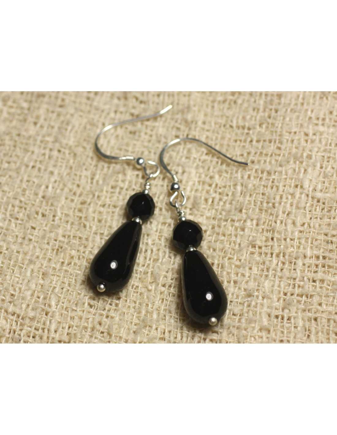 Boucles d'Oreilles Argent 925 - Onyx Noir Gouttes 15x8mm et rondes Facettées 6mm