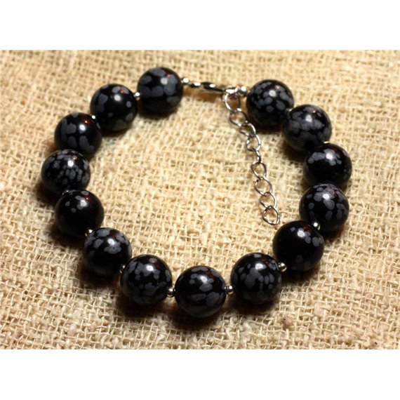 Bracelet Argent 925 et Pierre - Obsidienne Flocon de neige mouchetée 10mm