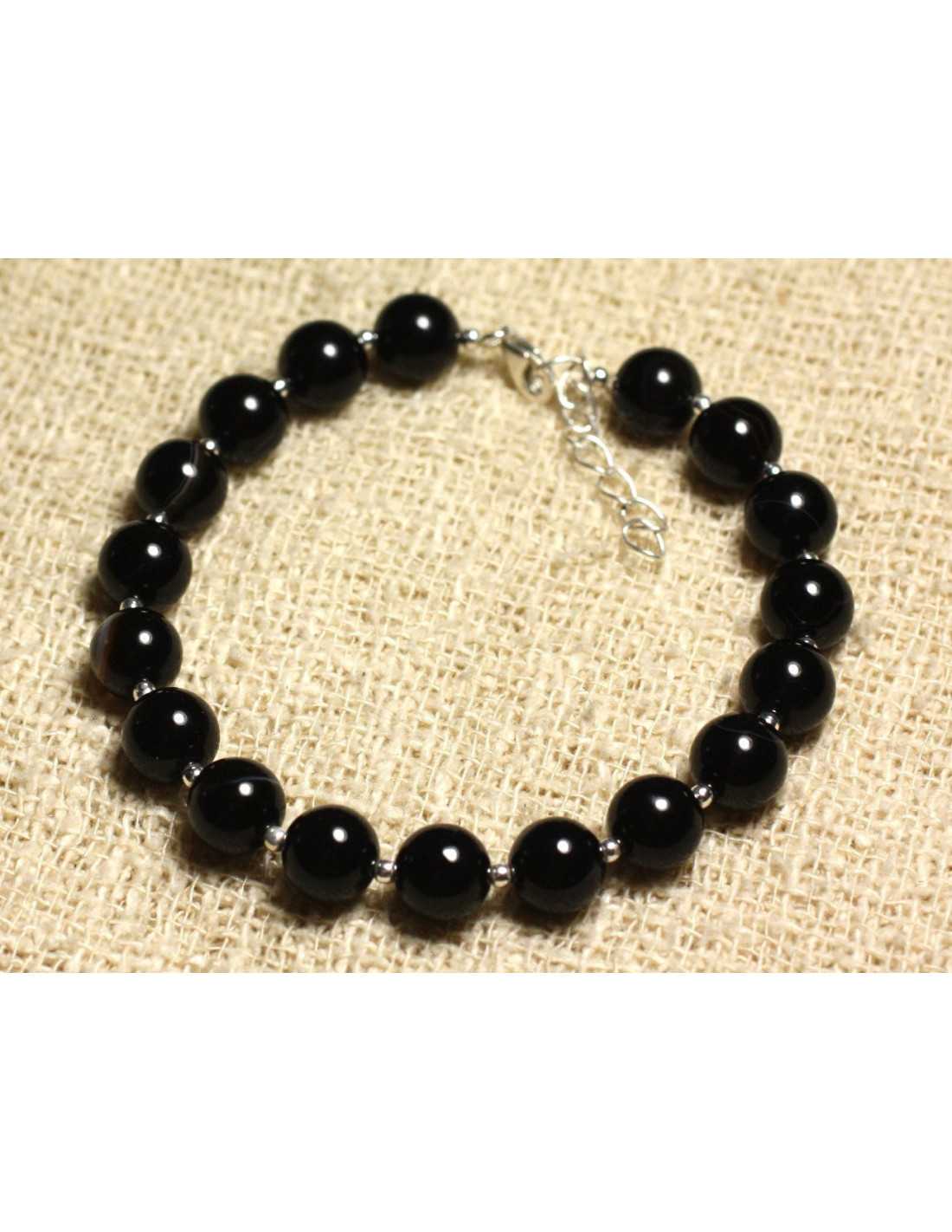 Bracelet Argent 925 et Pierre semi précieuse - Agate Noire 8mm