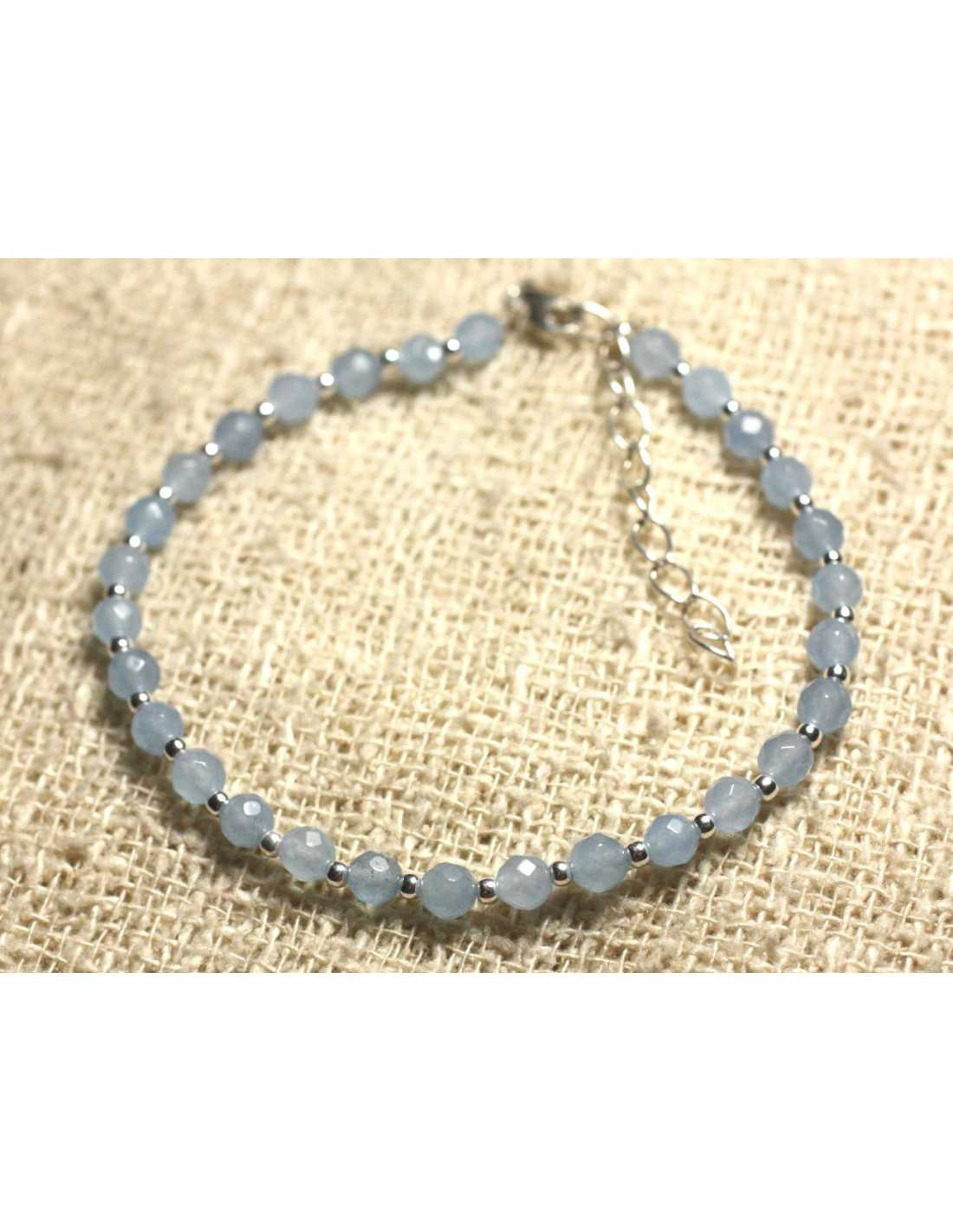 Bracelet 925 Silver and Faceted Blue Jade semi-precious stone 4mm Natural tinted semi-precious stone Color Light blue, transparent Round faceted beads 4 mm approximately Spacer beads in Silver 925, round 2mm Lobster clasp and chain in 925 Silver Length with clasp: 17 cm + 4 cm of silver chain