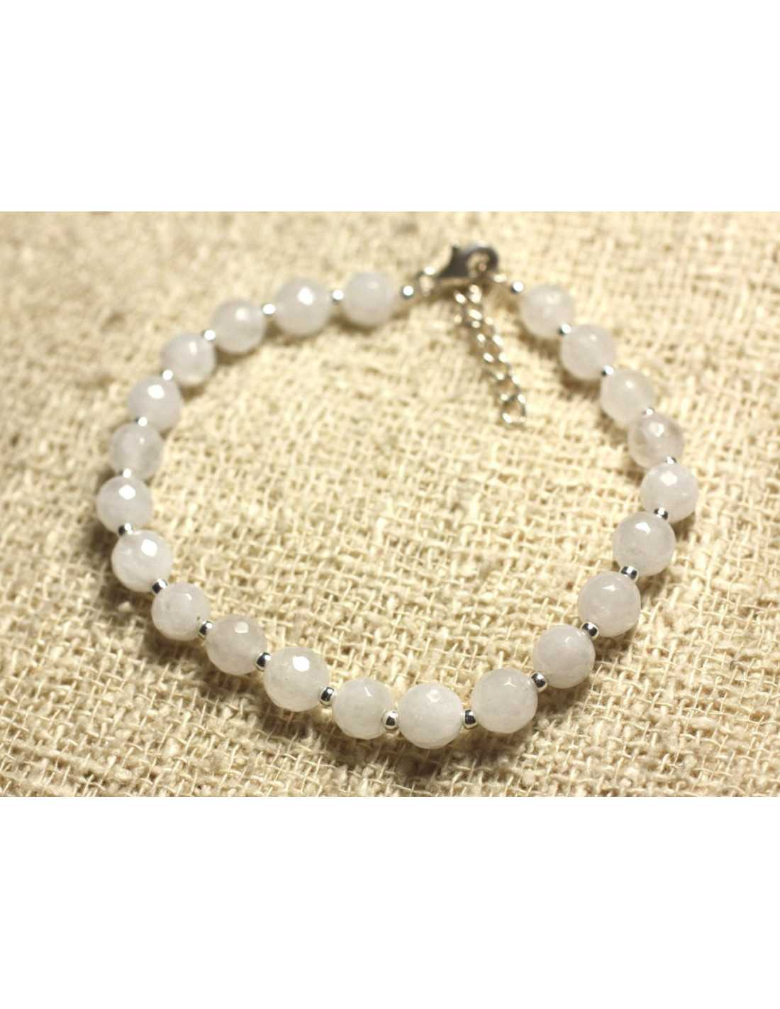 Bracelet 925 Silver and Semi-precious stone Faceted White Jade 6mm Natural semi-precious stone Color White, transparent Round faceted beads 6 mm approximately Spacer beads in 925 Silver, round 2mm Lobster clasp and Chain in 925 Silver Length with clasp: 17 cm + 4 cm silver chain