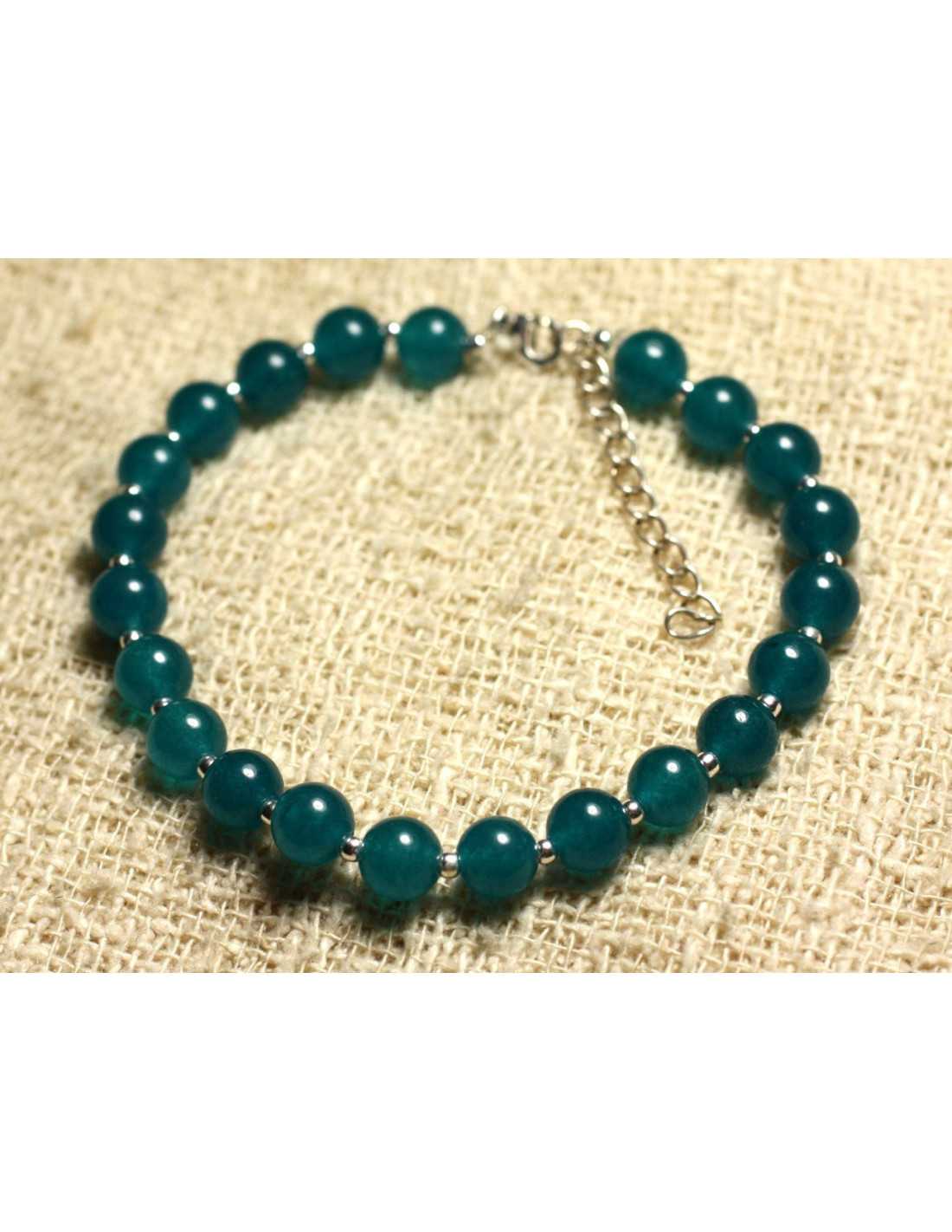 Bracelet 925 Silver and Semi-precious stone Blue Green Jade 6mm Natural semi-precious stone Color Blue Green, transparent Round beads approx. 6 mm Spacer beads in 925 Silver, round 2mm Lobster clasp and Chain in 925 Silver Length with clasp: 17 cm + 4 cm silver chain