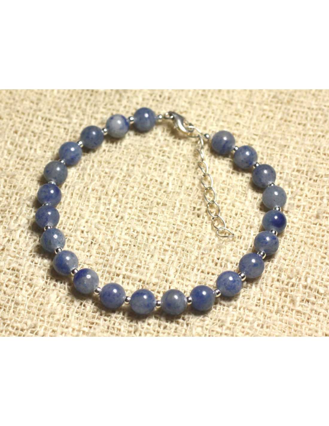 Bracelet 925 Silver and semi-precious stone Blue Jasper Natural semi-precious stone Blue color, slightly transparent Round beads approx. 6 mm Spacer beads in 925 Silver, round 2 mm Lobster clasp and chain in 925 Silver Length with clasp: 17 cm + 4 cm of chain in silver