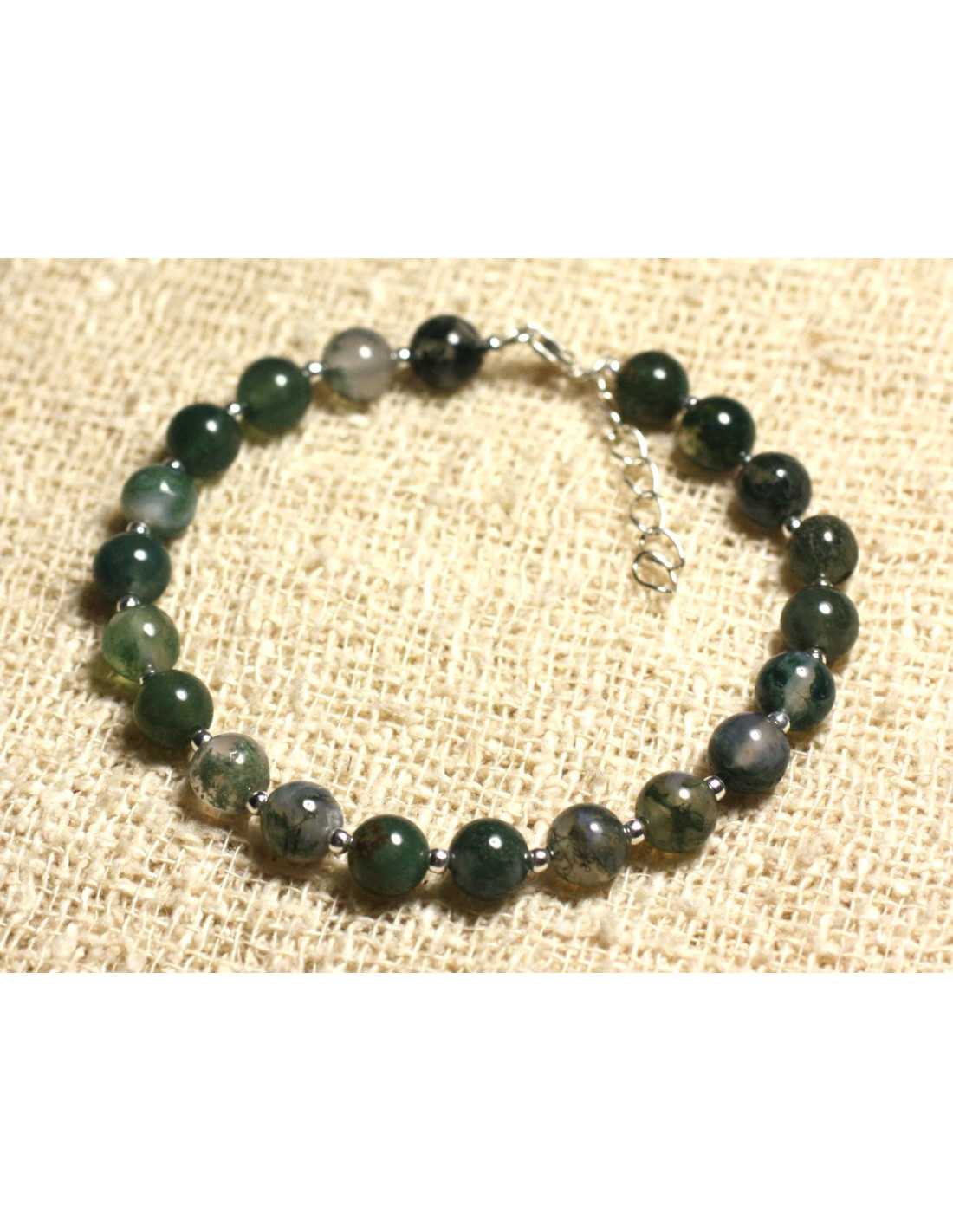 Bracelet Silver 925 and semi-precious stone Moss Agate Natural semi-precious stone Color White, Gray, Green, transparent, with inclusions Round beads approximately 6 mm Spacer beads in Silver 925, round 2 mm Lobster clasp and Chain in 925 Silver Length with clasp: 17 cm + 4 cm of silver chain