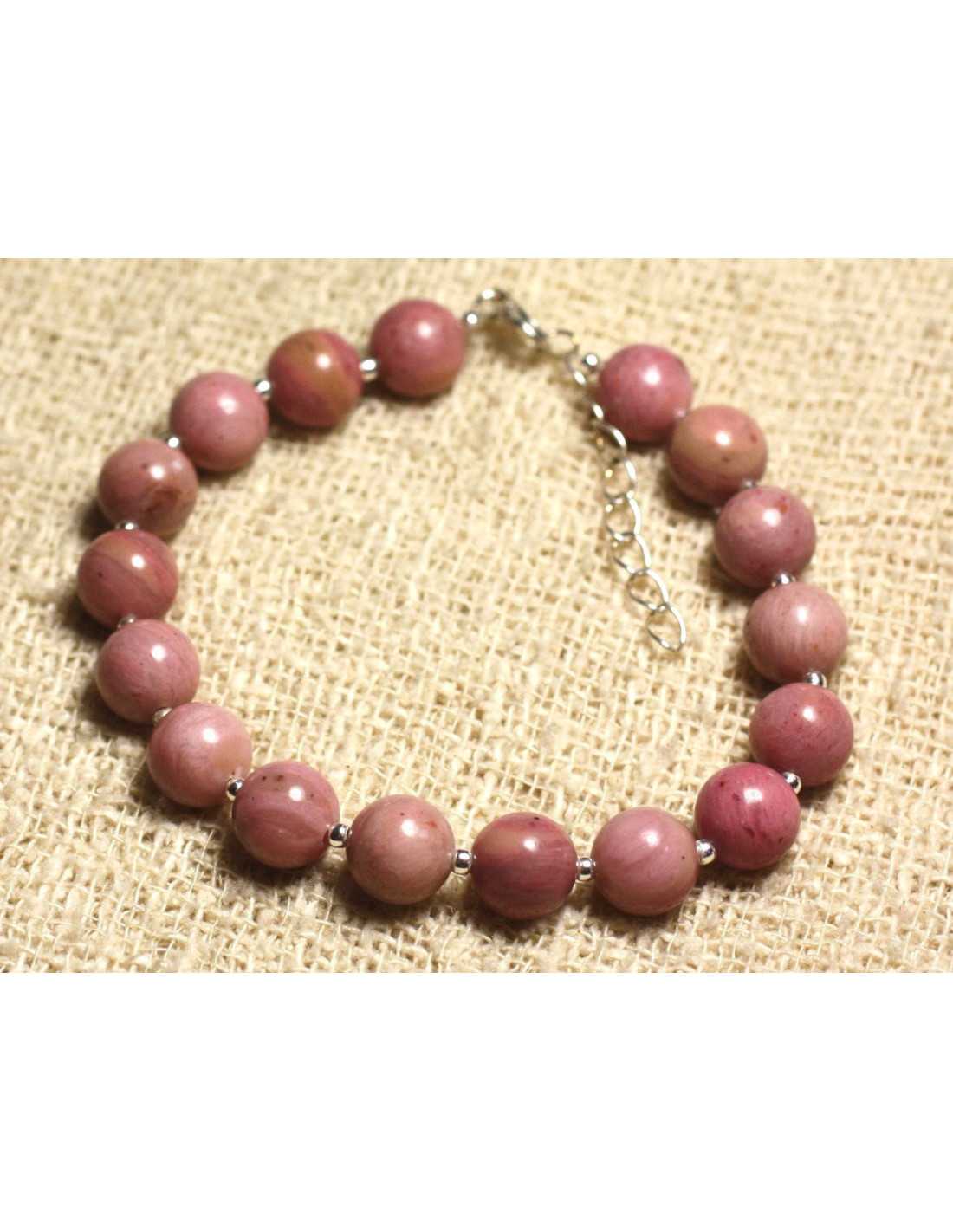 Bracelet 925 Silver and semi-precious stone Rhodonite Natural semi-precious stone Pink color Round beads approx. 8 mm Spacer beads in 925 Silver, round 2 mm Lobster clasp and 925 Silver chain Length with clasp: 17 cm + 4 cm of silver chain