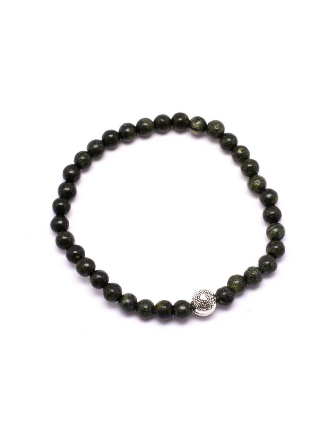 Elastic Bracelet Stone and Silver Serpentine Pearl Natural semi precious stone Color green, khaki, yellow, black Round beads 4mm Silver metal bead quality heart and dots pattern, round 6mm Bracelet made on elastic flexible and very solid fiber Length 17 cm Inside diameter of the bracelet Approximately 5.5cm Size of the bracelet adjusted on request Other stones or mixture of stones possible, do not hesitate to contact me for a personalized jewel **** **** **** ****