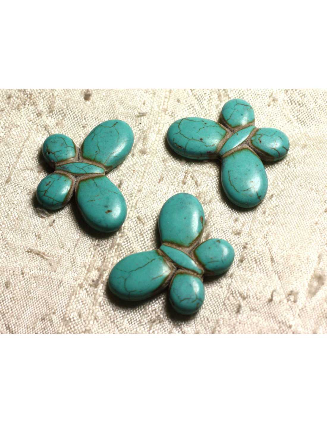 Thread 39cm - Turquoise Stone Beads Reconstituted Synthesis Butterflies 35mm Synthetic stone Color Turquoise Blue Shape Butterflies pierced from top to bottom, in the width Dimensions Length 35mm x Width 25mm x Thickness 6mm approximately Drilling dimension 1mm approximately Sold by thread of 39cm Approximately 21 beads by wire