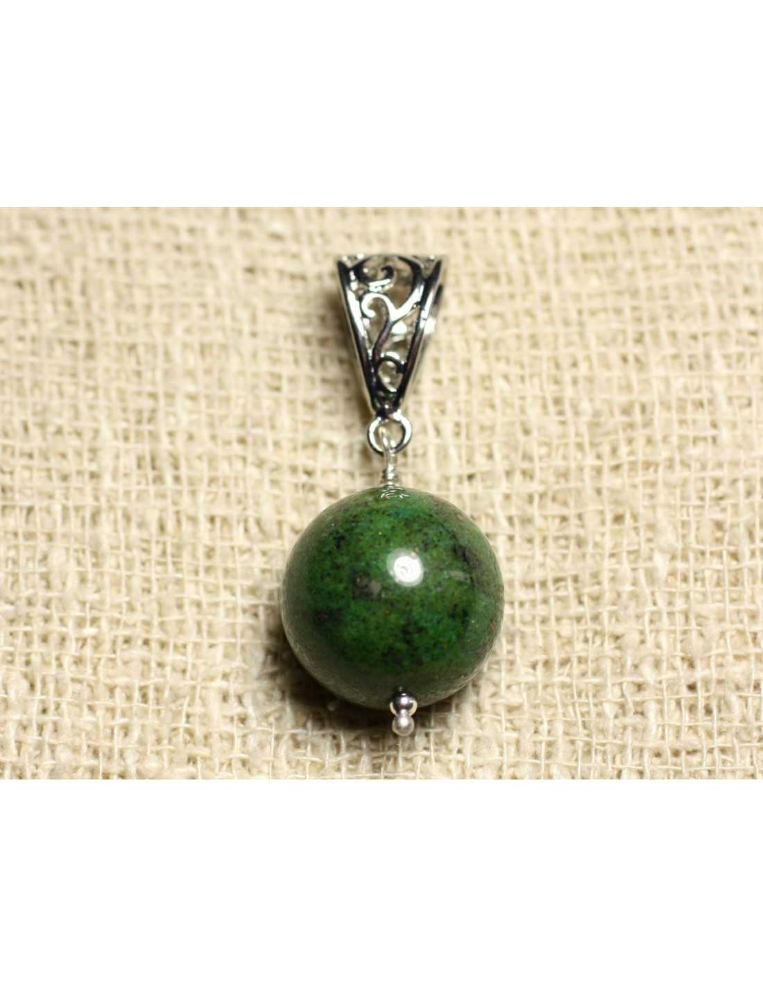Semi-precious Stone and Rhodium Pendant Green Pyrite Natural semi-precious stone Color green, gold Round Pearl Size 16mm Rhodium-plated quality Silvery Metal Filigree Bead Dimensions 11 x 6 mm Pendant sold with an Organza or waxed cotton necklace Customization possible with stones and colors of your choice