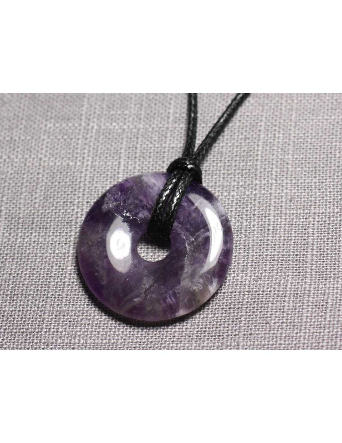 Necklace Pendant Semi precious stone Amethyst Chevron Natural semi precious stone Color purple, mauve, transparent Donut shape Dimensions Diameter 30mm x Thickness 6mm Internal dimension 7mm approximately Waxed cotton cord Adjustable size thanks to a practical and solid sliding closure Choice of colors Colors and patterns may vary depending on the stone