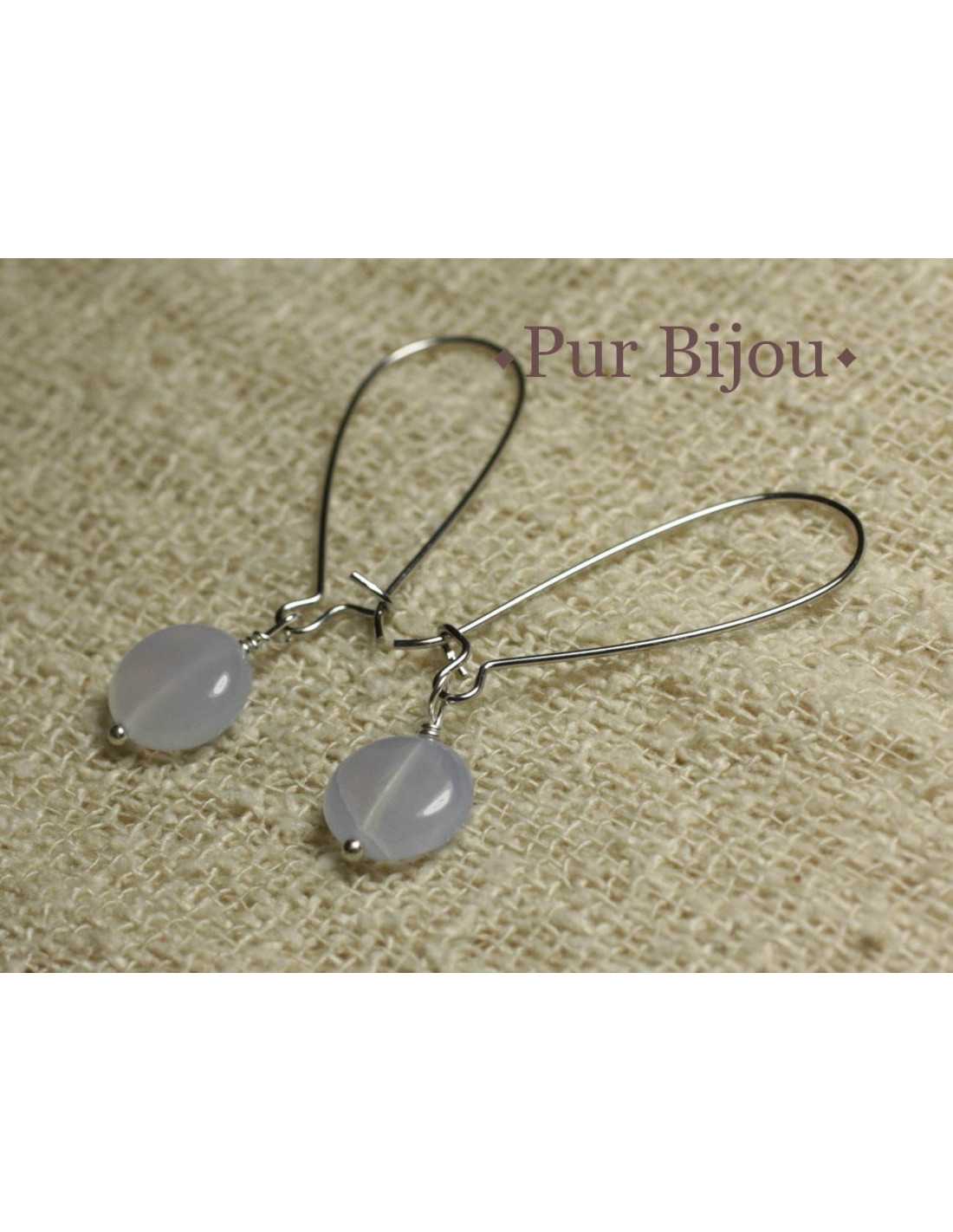 Boucles d'Oreilles Pierre Semi précieuse Perles de Calcédoine Pierre semi précieuse naturelle bleu clair transparente Longs Crochets argentés garantis sans plomb et sans nickel 33x8mm Perles Calcédoine palets 10mm environ Longueur des boucles : 52 mm environ De nombreuses perles de pierres et couleurs disponibles Réalisations personnalisées sur simple demande Pour toute question, merci de me contacter via ALM ou sur purbijou1@gmail.com, je vous répondrai dans les plus brefs délais Merci de votre visite !