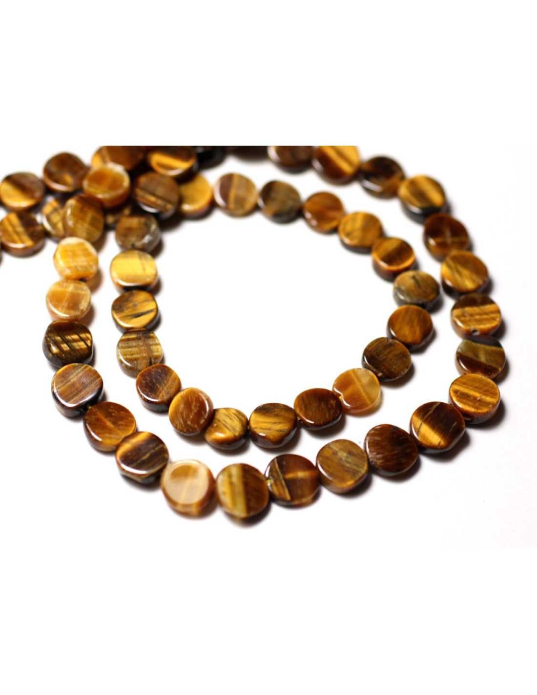 Tiger Eye Stone Beads Natural semi-precious stone Color brown, black, bronze, gold, with reflections Shape Palets Dimension Diameter 6-7mm x Thickness 1-3mm approximately Drilling dimension approximately 0.5mm Sold by strand of 35cm Approximately 53 beads per strand