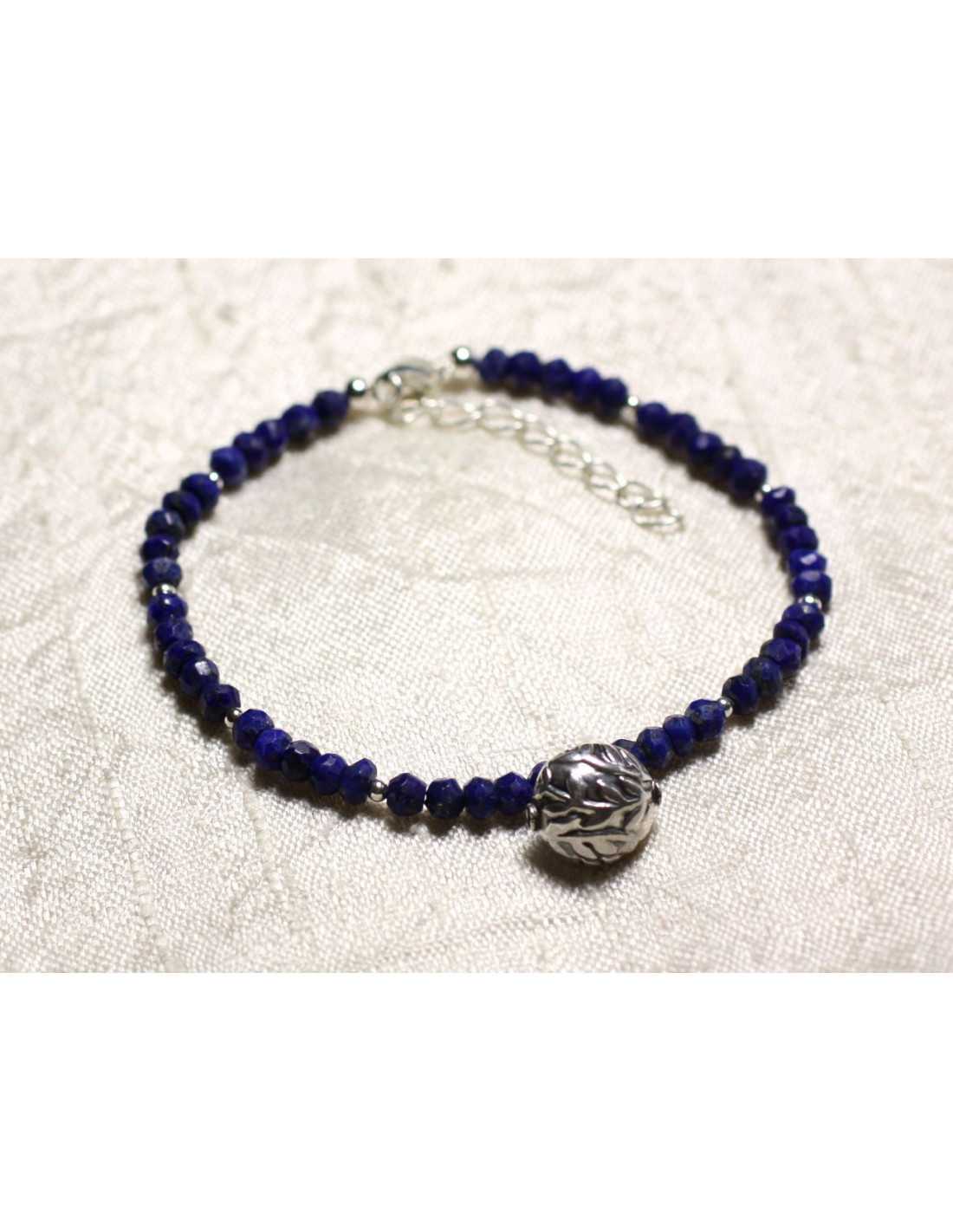 Bracelet 925 Silver and Lapis Lazuli stone faceted washers 3x2mm Natural gemstone Color midnight blue, gold Faceted rondelle beads 3x2mm 925 Silver round beads 2mm Ornate 925 silver bead, leaf pattern puck 10mm or other 925 silver bead of your choice Length 17cm + 4cm of extension chain in silver 925 Made on strong and resistant fluorocarbon wire