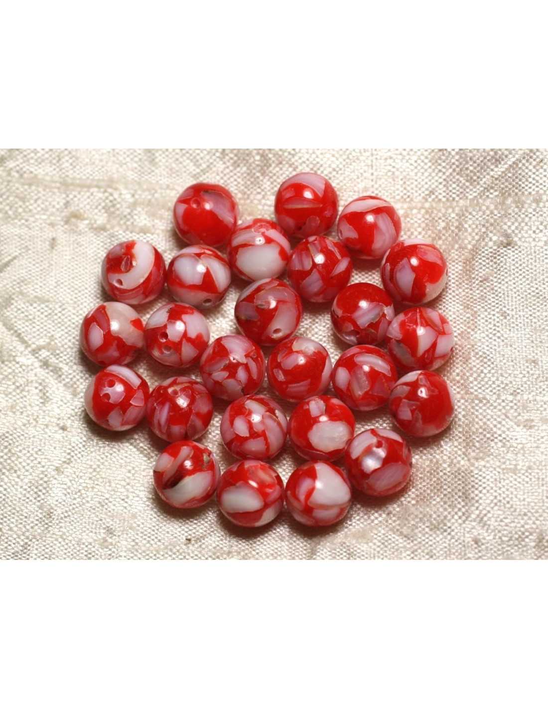 10pc - Mother of Pearl and Resin Beads - Red and White 10mm Balls 4558550015792