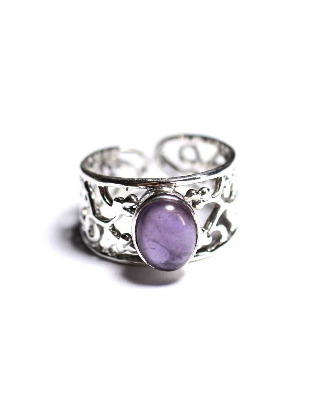Ring Silver 925 and semi-precious stone Amethyst Natural semi-precious stone Color purple, transparent Oval shape Dimension Length 9mm x Width 7mm approximately Stone set in 925/1000 silver Large ring with arabesque pattern, filigree Width 5 to 11 mm approximately Minimum adjustable size 53