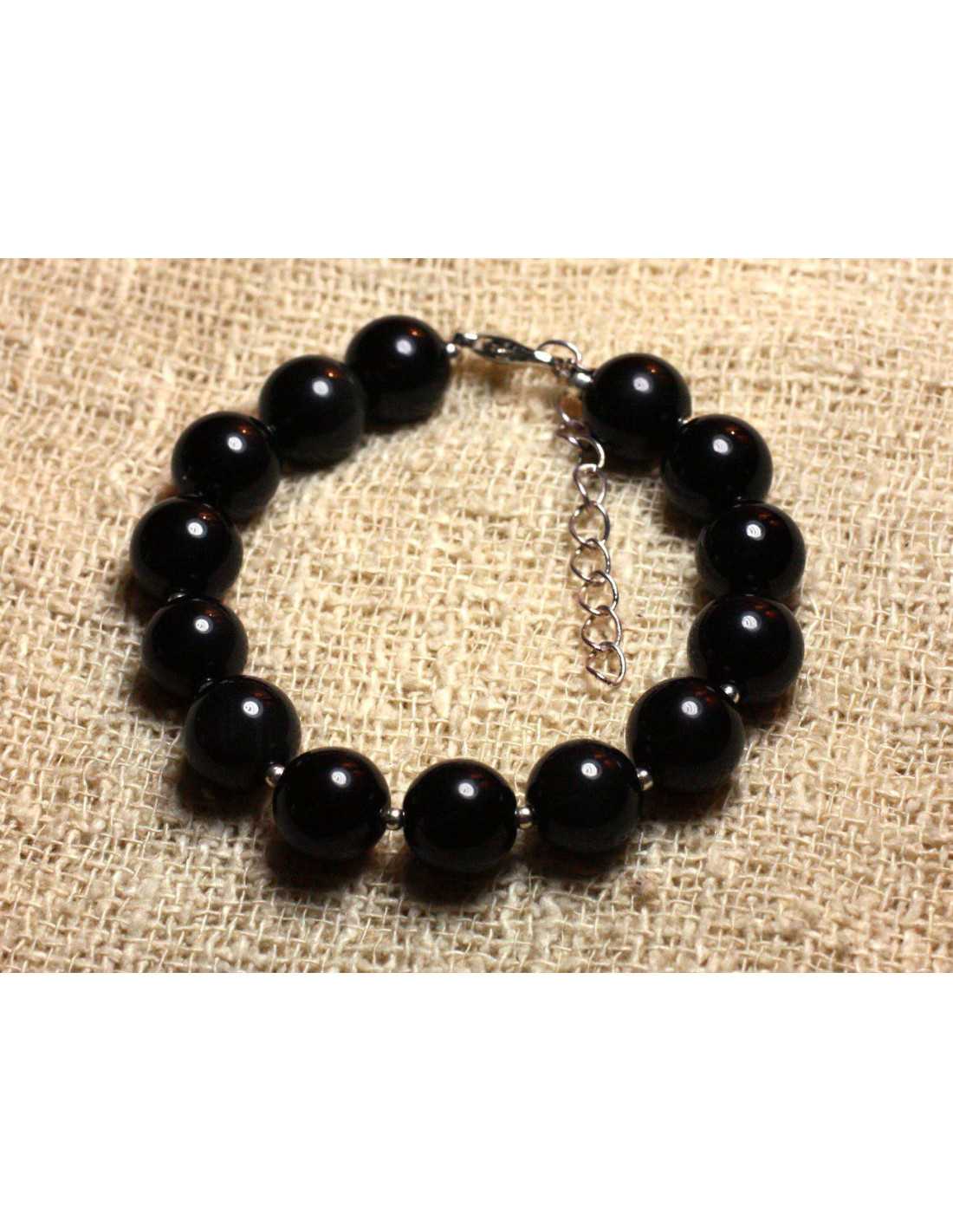 Bracelet 925 Silver and semi-precious stone Rainbow Obsidian Natural semi-precious stone Black color, silver gray reflections Round beads approx. 10mm Spacer beads in 925 Silver, round 2mm Lobster clasp and Chain in 925 Silver Length with clasp: 17 cm + 4 cm long silver chain