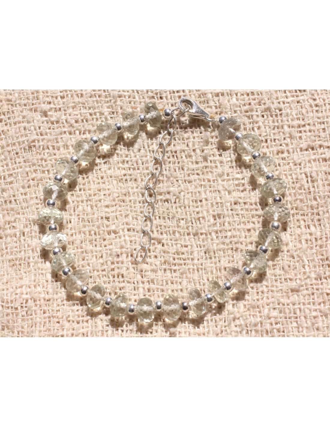 Bracelet 925 Silver and Phrenite Stone Faceted Rondelles 7mm Natural semi-precious stone Color light green, transparent Faceted Rondelle Beads 7 x 3-5mm approximately 925 Silver spacer beads, Round 3mm Lobster clasp and 925 Silver chain Length with clasp: 17 cm + 4 cm of silver chain
