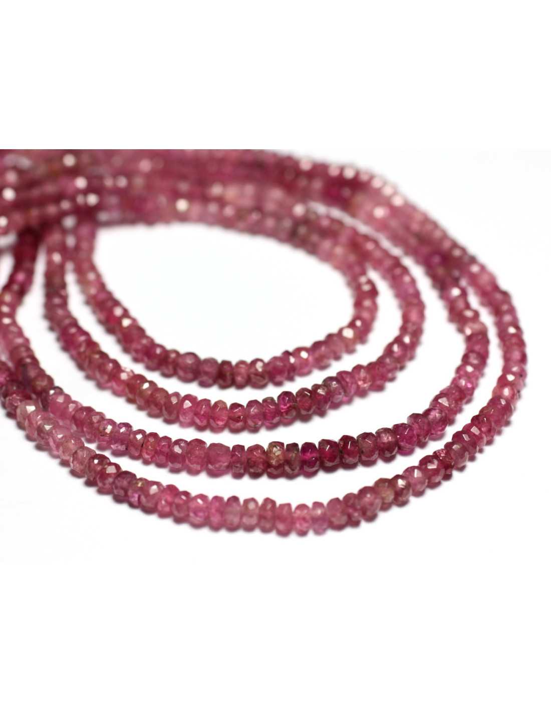 Perles de Pierre Tourmaline Verte et Rose Rondelles Facettées Pierre semi précieuse naturelle Couleur vert, rose, transparent Forme Rondelles Facettées Dimensions 3x2mm environ Dimension perçage 0.3mm environ Vendues par fil de 245 perles environ