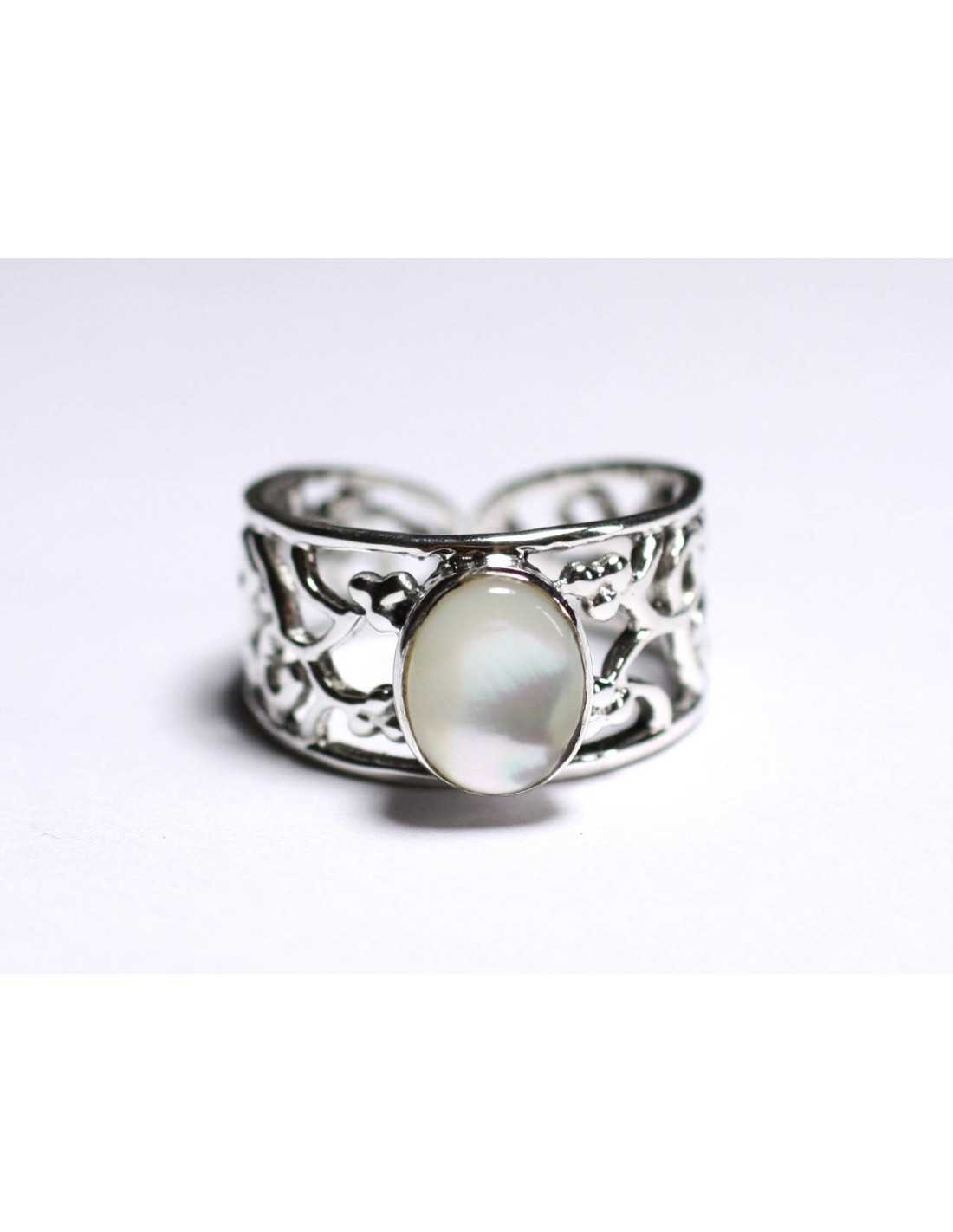 Anello Argento 925 e madreperla bianca iridescente Madreperla bianca naturale Colore bianco, con riflessi iridescenti Forma ovale Dimensioni 9x7mm circa Madreperla montata in argento 925/1000 Anello grande con motivo arabescato, filigrana Larghezza da 5 a 11mm Misura minima regolabile 53