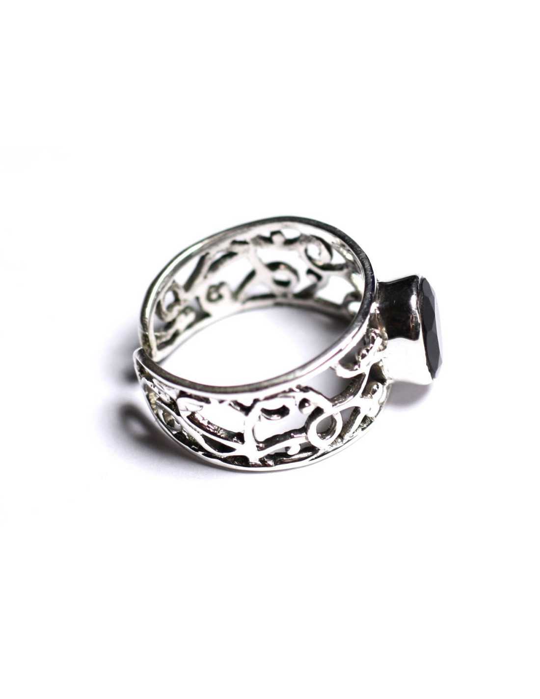 Anello Argento 925 e pietra semipreziosa Spinello nero Pietra semipreziosa naturale sfaccettata Colore nero Forma ovale Dimensioni 9x7mm circa Pietra incastonata in argento 925/1000 Anello grande con motivo ad arabesco, filigrana Larghezza da 5 a 11 mm Misura minima regolabile 53