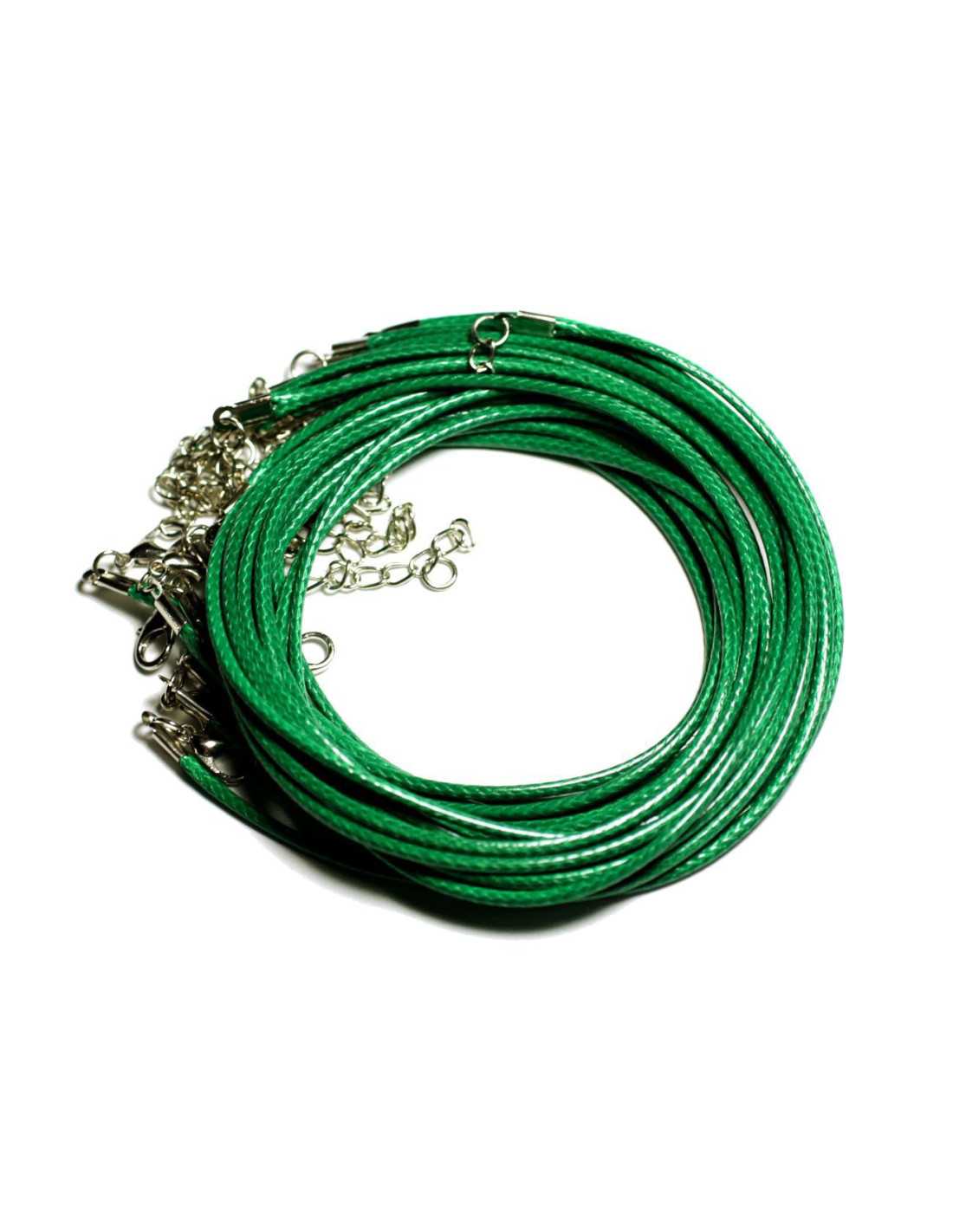 Collane Collane in cotone cerato Colore verde impero Cotone cerato rivestito di qualità Forma rotonda, diametro circa 2 mm Lunghezza 45 cm + 4 cm catena d'argento Fermaglio a moschettone in metallo argentato 12x6 mm Tappi terminali in metallo argento 10x4 mm Venduto in set di 100 collane