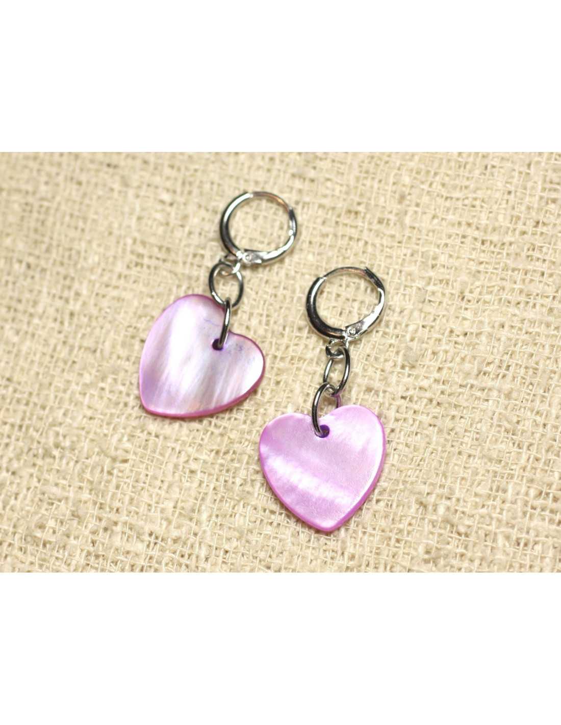 Orecchini Cuori in Madreperla 18mm Purple Pink Heart Charms 18mm in madreperla naturale colorata Colore Rosa Viola con riflessi cangianti Ganci a cerchio in argento rodiato o opzionalmente anche con ganci in argento 925/1000 Altri colori sono disponibili in negozio