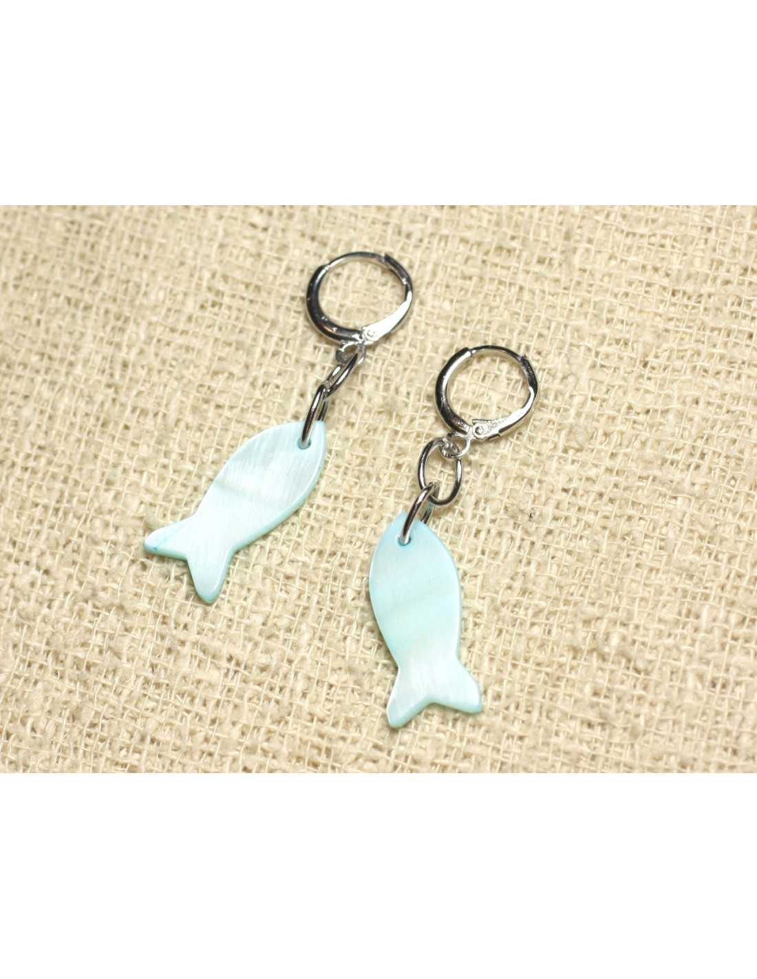 Orecchini Pesce Madreperla 23mm Blu Turchese Pastello Charms Pesce in madreperla naturale colorata Colore Blu Turchese Pastello con riflessi cangianti Abbaini in metallo argentato rodiato o a scelta anche con ganci in argento 925/1000