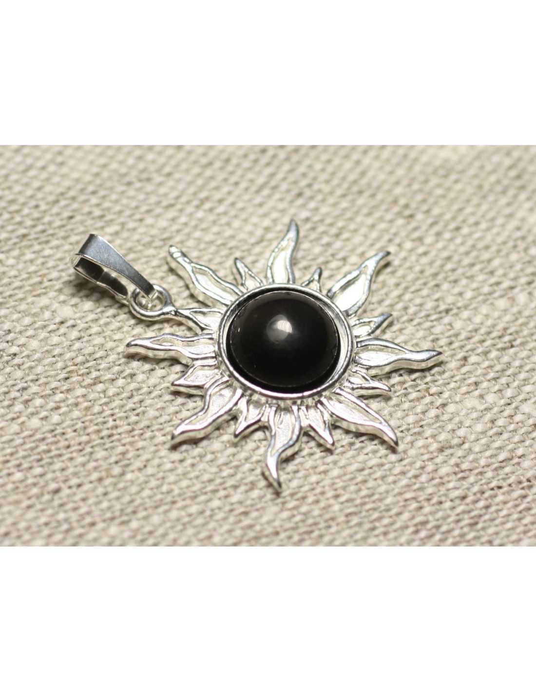 Ciondolo Argento 925 e Pietra - Sole 28mm - Ossidiana rotonda nera arcobaleno 10mm