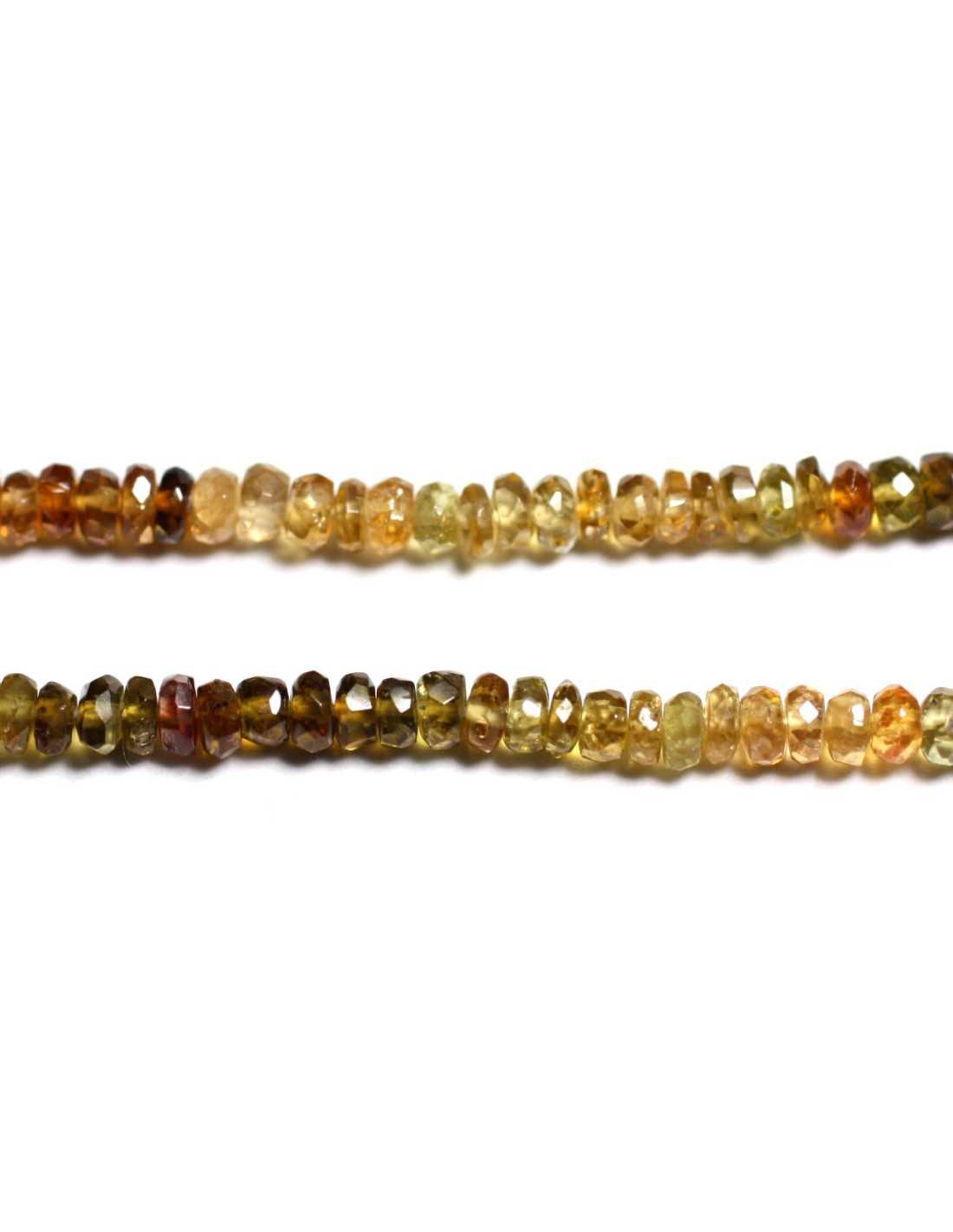 Perles de Pierre Petro Tourmaline Rondelles Facettées Pierre semi précieuse naturelle Couleur jaune, orange, ocre, vert, kaki, transparent Forme Rondelles Facettées Dimensions 3x2mm environ Dimension perçage 0.3mm environ Vendues par fil de 255 perles environ