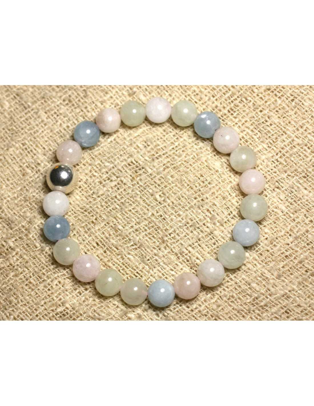 Armband 925 zilver en halfedelsteen Aquamarijn Kunziet en Morganiet 8mm Natuurlijke halfedelstenen Kleur wit, roze, blauw, lichtgroen, licht transparant Ronde kralen circa 8mm Centrale ronde 925 zilveren kraal 10mm Armband gemonteerd op dik en bestendig elastiek Ook haalbaar met 925 zilveren sluiting